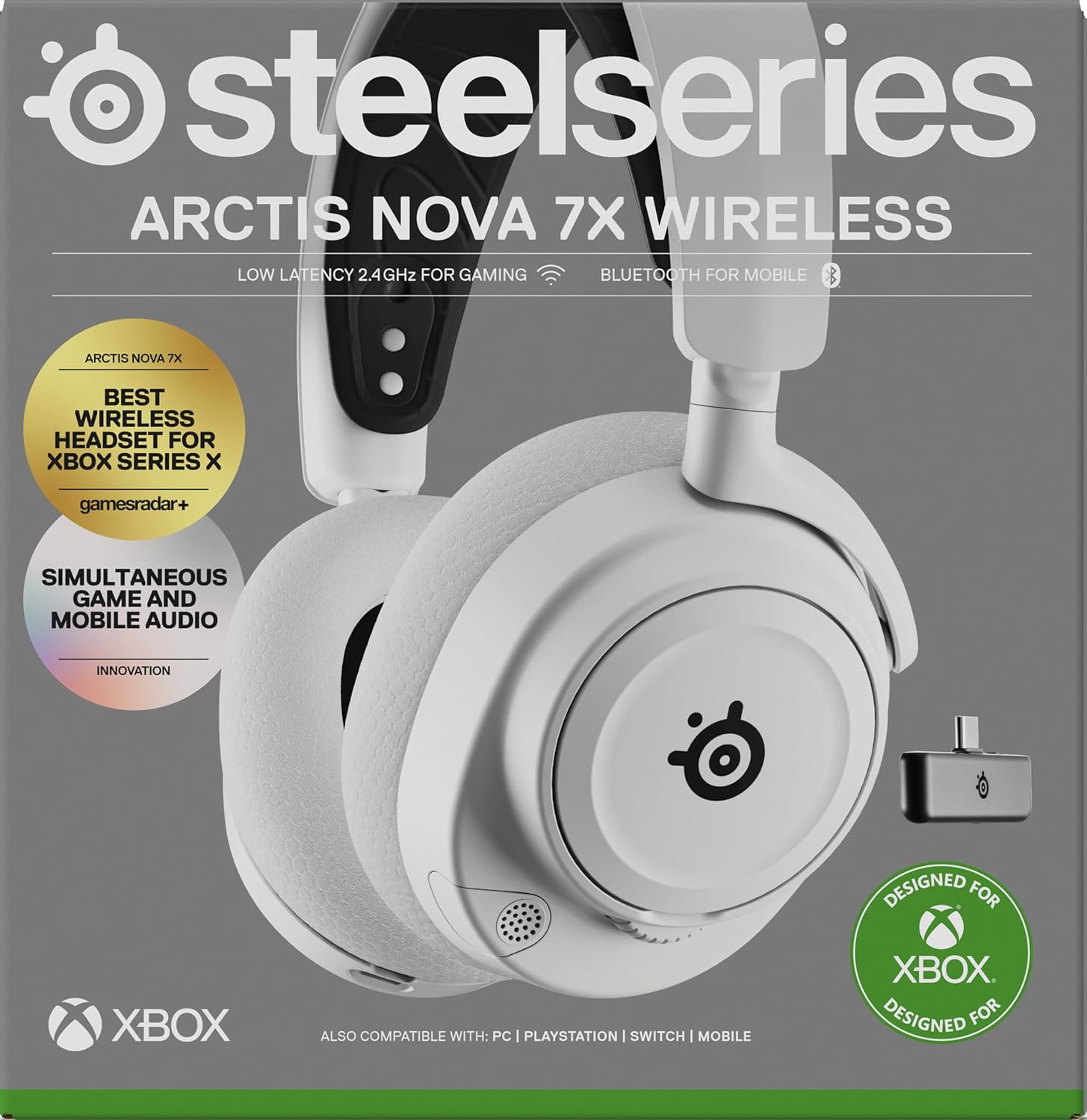 - Multi-Plattform-Kompatibilität - Verbinde das Arctis Nova 7 über ein kompaktes USB-C-Dongle für verzögerungsfreies Quantum 2.0 Wireless (2,4 GHz) mit deiner Xbox, PC, Mac, PlayStation oder Switch. Ein USB-A-Adapter ist im Lieferumfang enthalten.