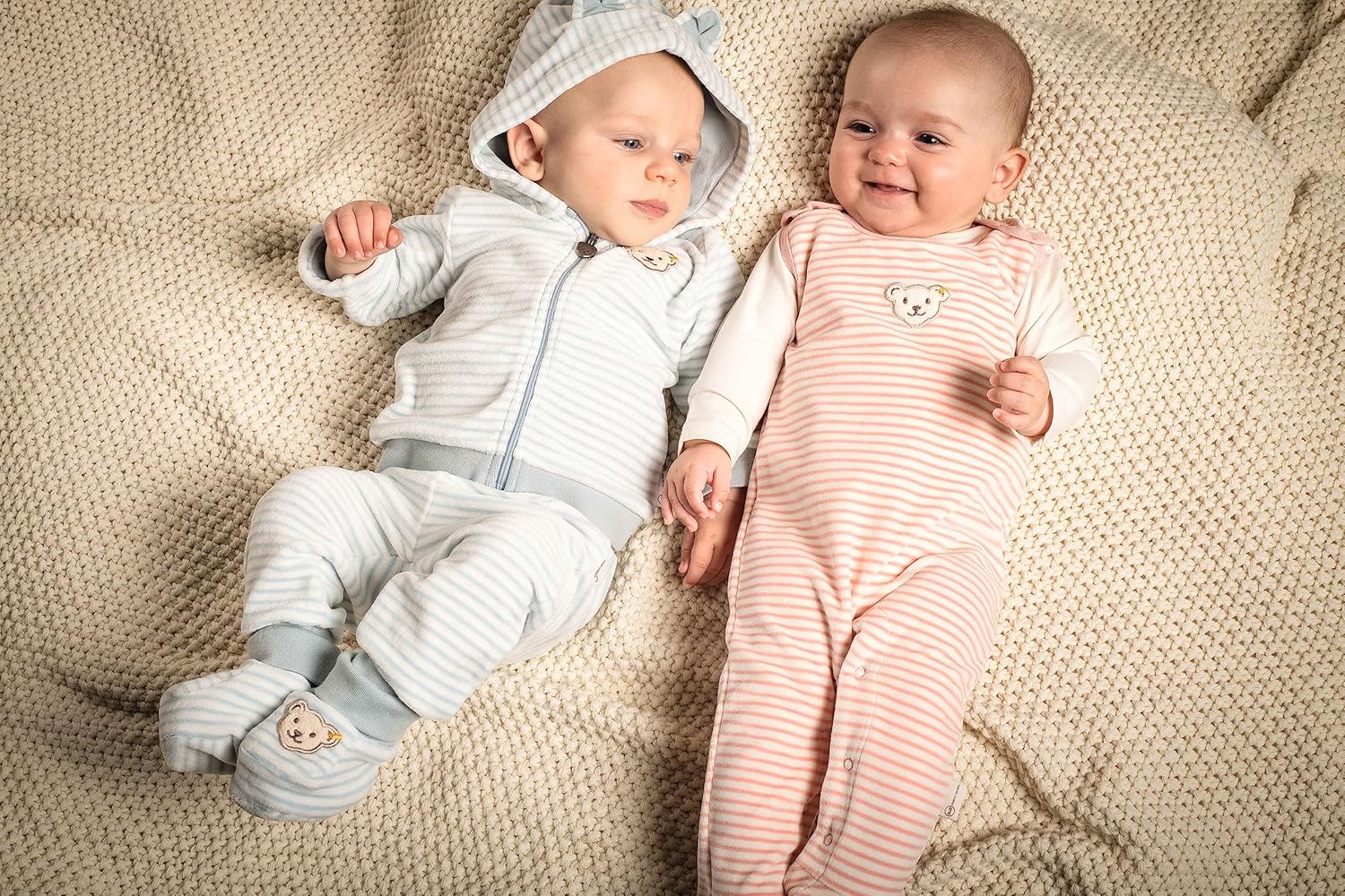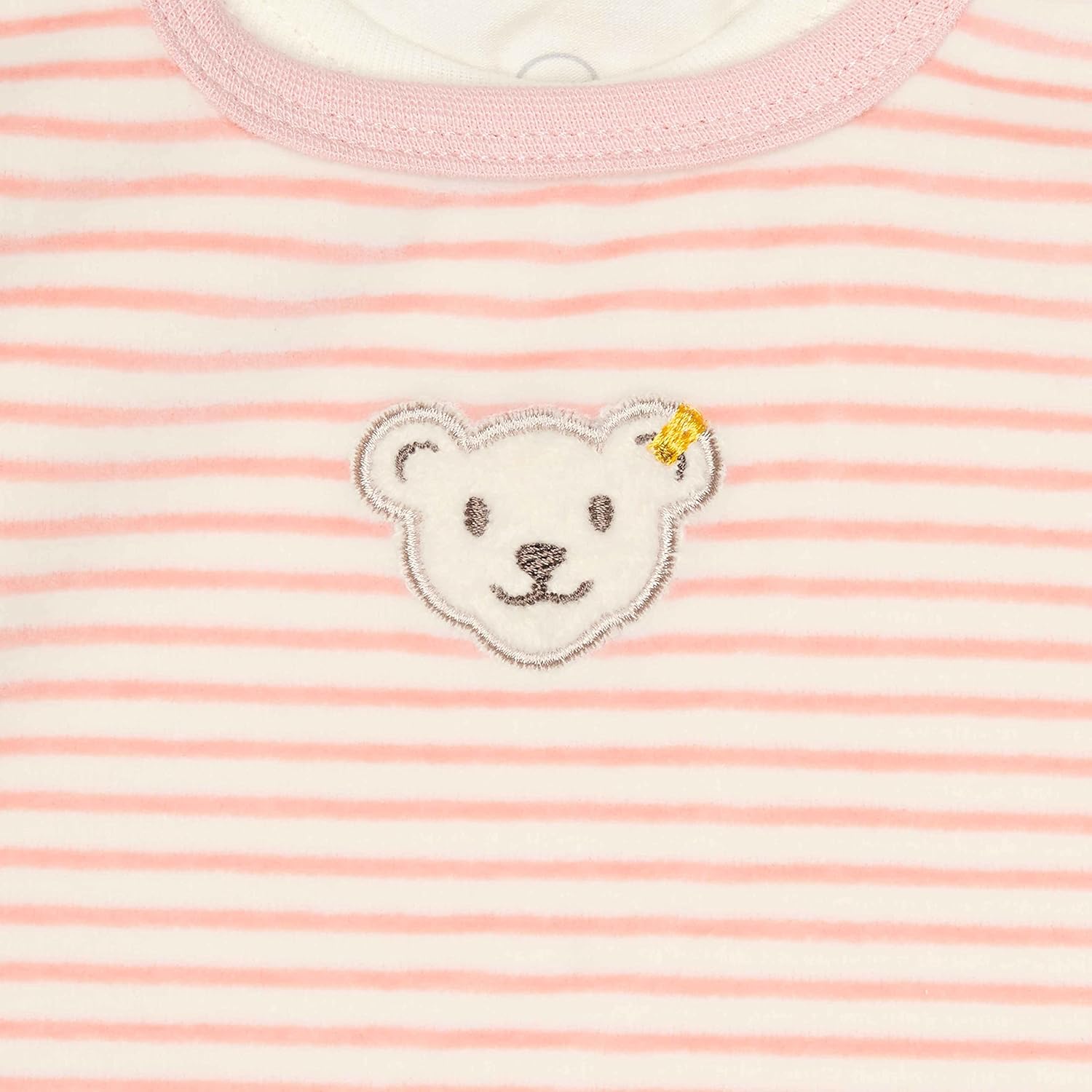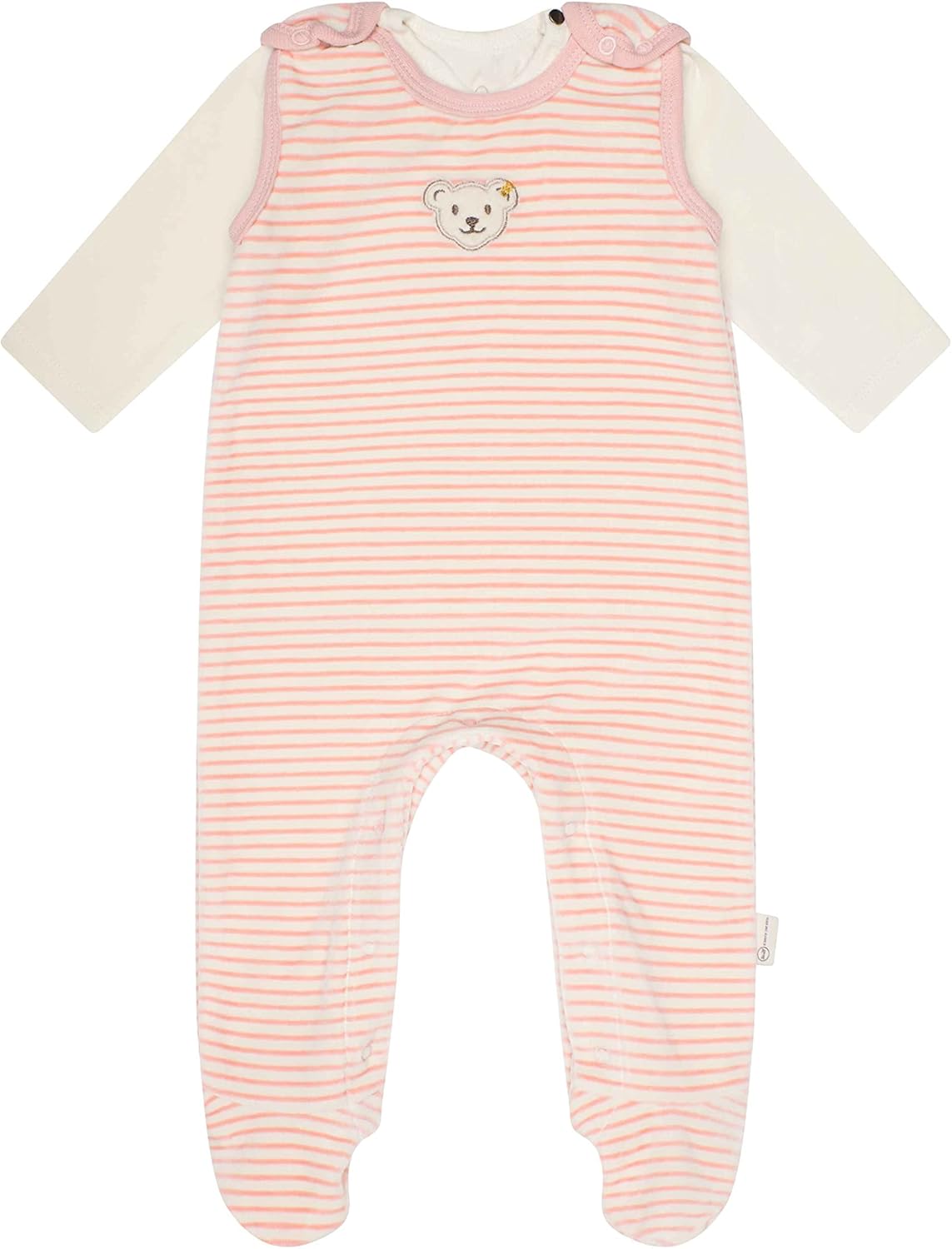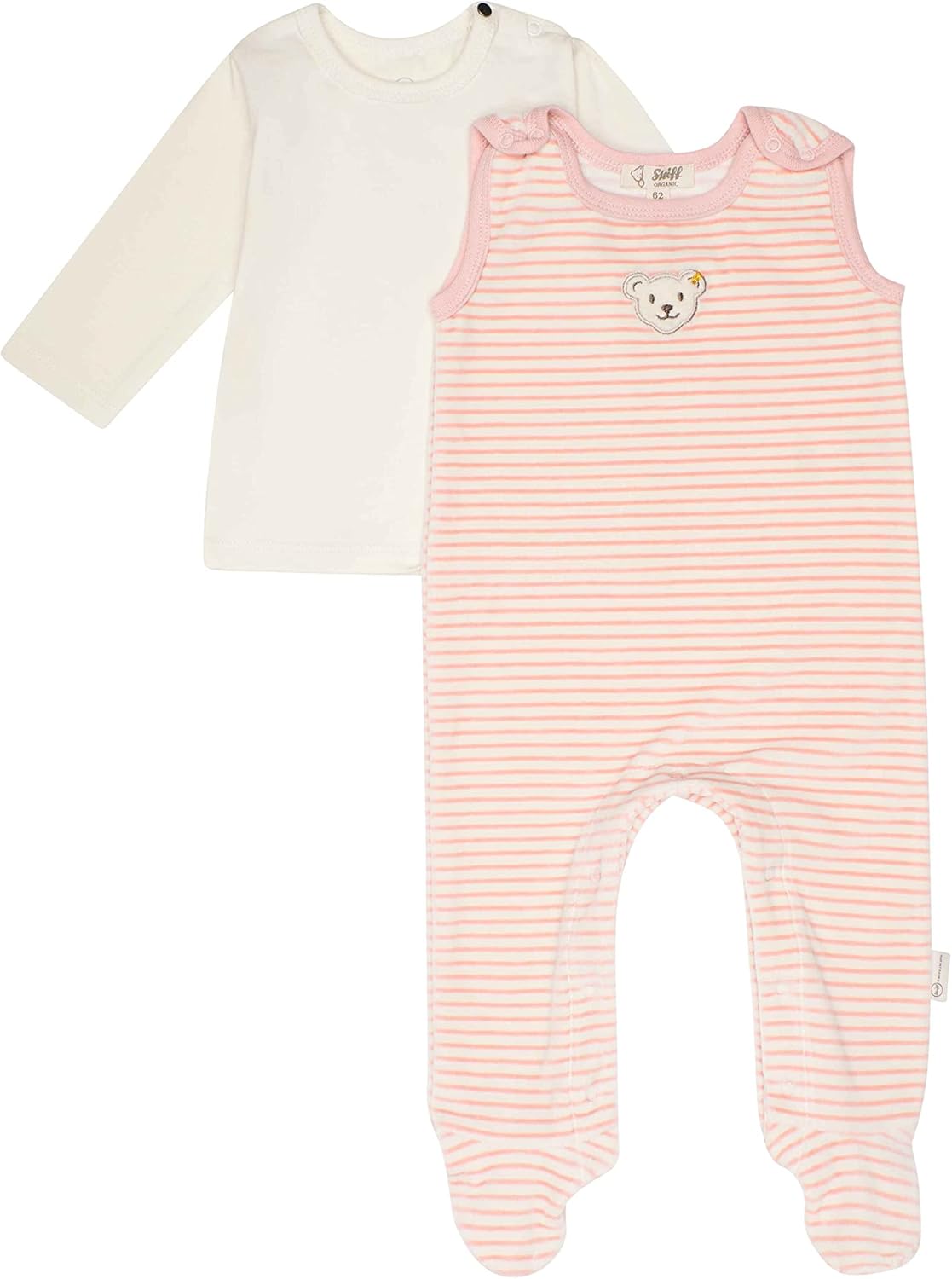 PRODUKTBESCHREIBUNGEN Aus samtigem Organic Velour und im 2er-Set mit einem leichten Langarmshirt begeistert dieser gemütliche Strampler die kleinsten Abenteurer. Schulteröffnung am Langarmshirt sowie Druckknöpfchen an Trägern und Beinen des Stramplers helfen beim Anziehen. Herrlich weich wärmen die Allrounder angenehm und bieten aktiven Kindern Bewegungsfreiheit. Hellblaue Streifen sind zauberhafte Hingucker. Für alle Fälle wird Ihr Kleines von einem flauschigen Steiff Teddybärmotiv durch den Tag begleitet. Die Basics sind aus Bio-Baumwolle gefertigt. Mehr