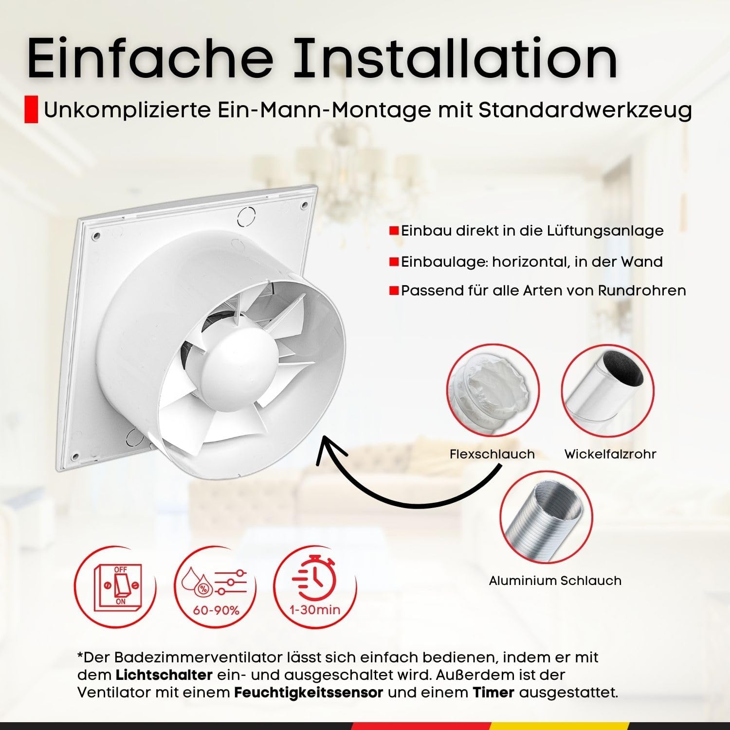 - Der Lüfter ist mit Nachlauftimer und Feuchtesensor ausgestattet, um ein Überschreiten der voreingestellten relativen Luftfeuchtigkeit im Raum zu verhindern