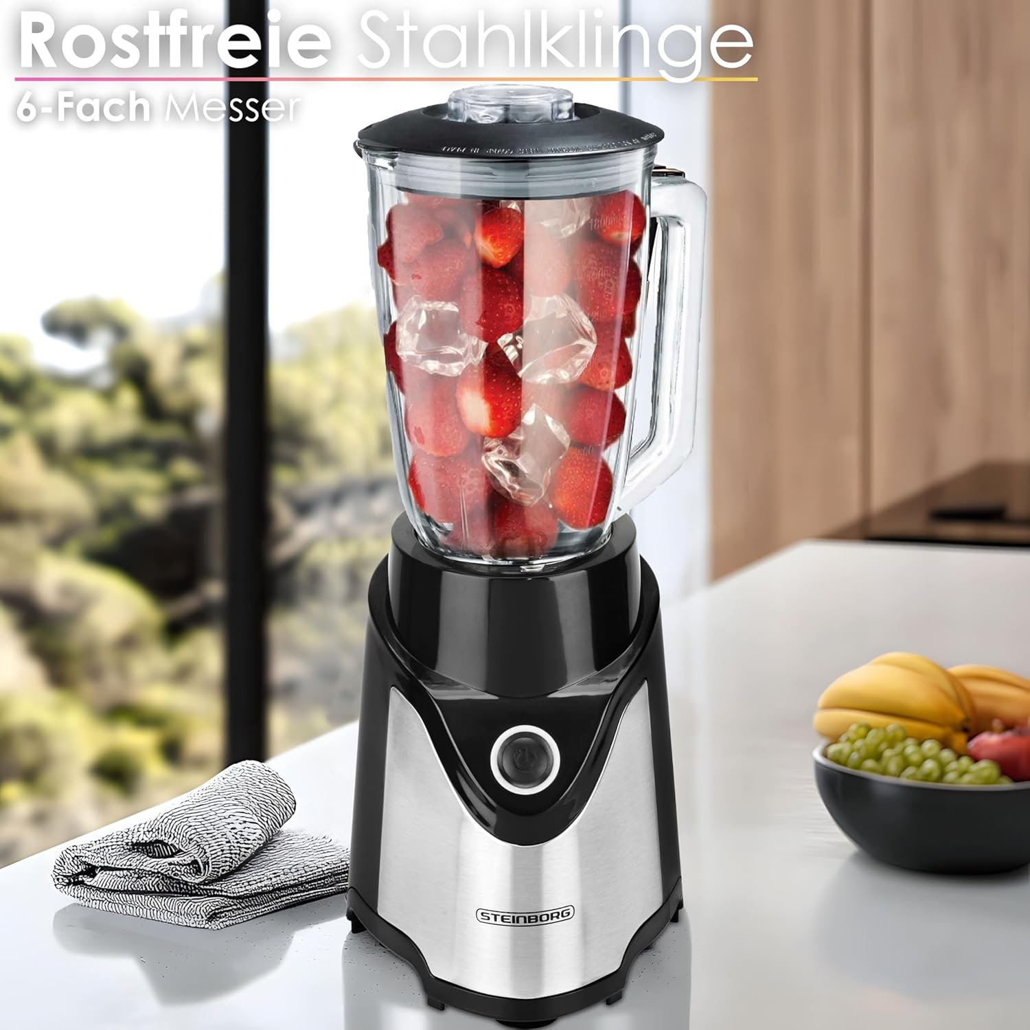 - ✔️ leistungsstark und effizient Mit einer Leistung von 500 Watt bringt der Standmixer genug Power mit, um selbst harte Zutaten wie Nüsse, Eiswürfel oder gefrorene Früchte mühelos zu zerkleinern. Dank des hochwertigen 6-fach Stahlmessers wird