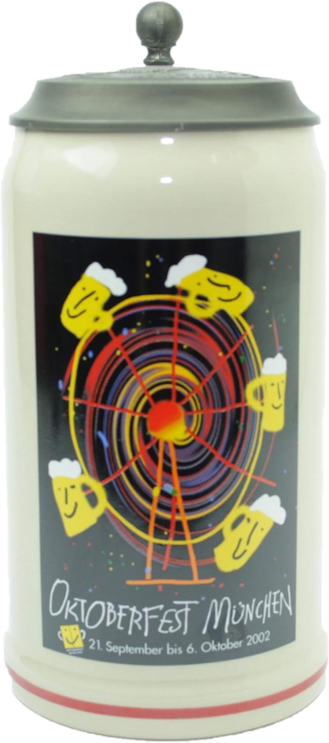 - Sie erhalten einen echten und original verpackten offiziellen Oktoberfestkrug aus dem Jahr 2002 mit Zinndeckel von Steinfixx
