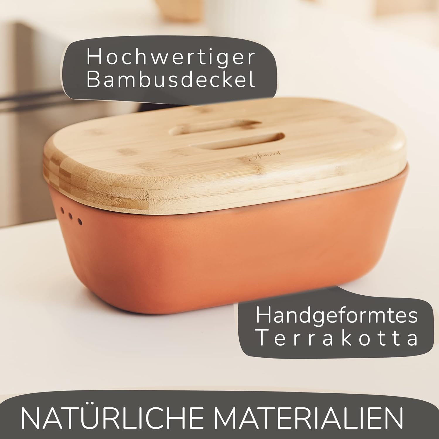 - 🥖 NATÜRLICHE MATERIALIEN - Dein STEINZEIT Brotkasten ist aus hochwertiger Terrakotta und der Deckel aus antibakteriellem Bambus. Absoluter Blickfang und maximale Langlebigkeit sind garantiert!
