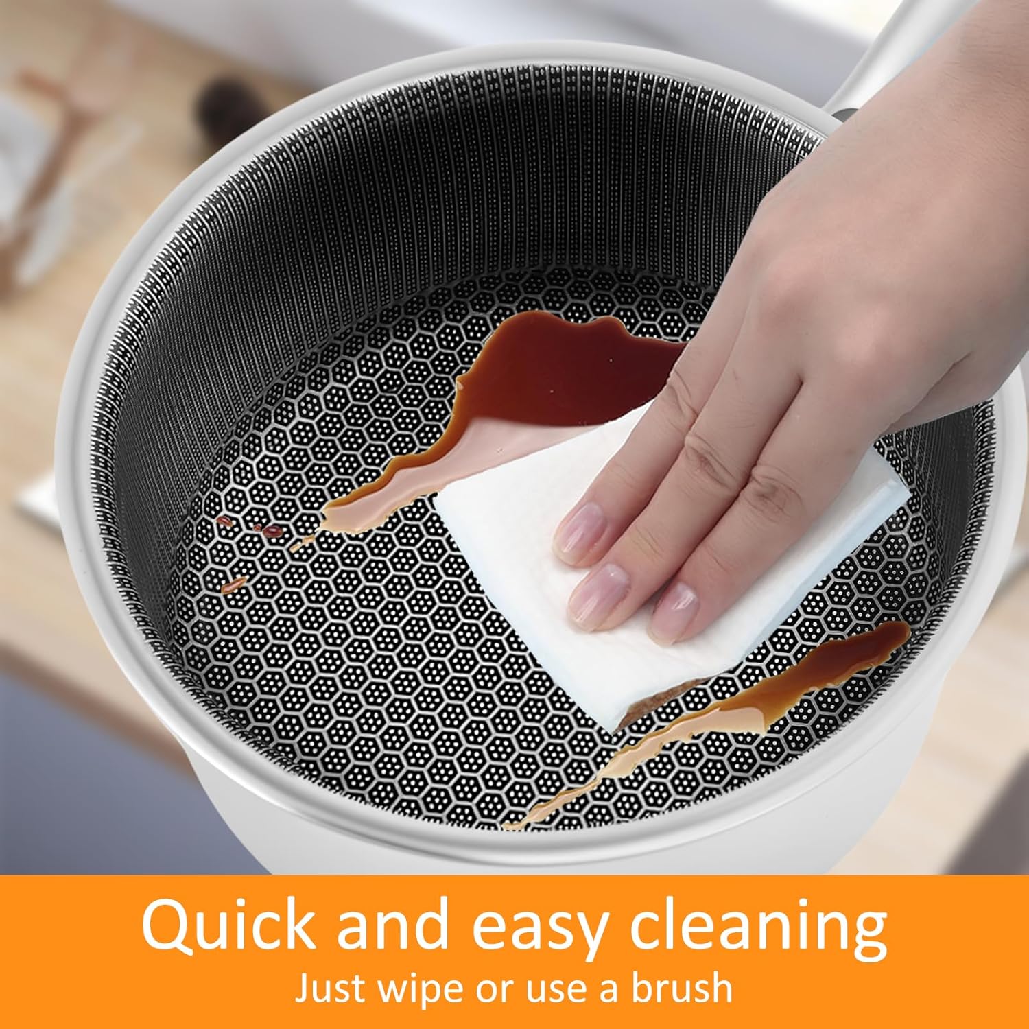 - Waben-Antihaftbeschichtung: Die Innenwand der Pfanne ist mit einem Wabenmuster versehen, das für Antihaftbeschichtung und Antihaftwirkung mit weniger Öl sorgt und die Handhabung beim Braten von Eiern, Kochen von Milch usw. erleichtert. Der Ölverbrauch