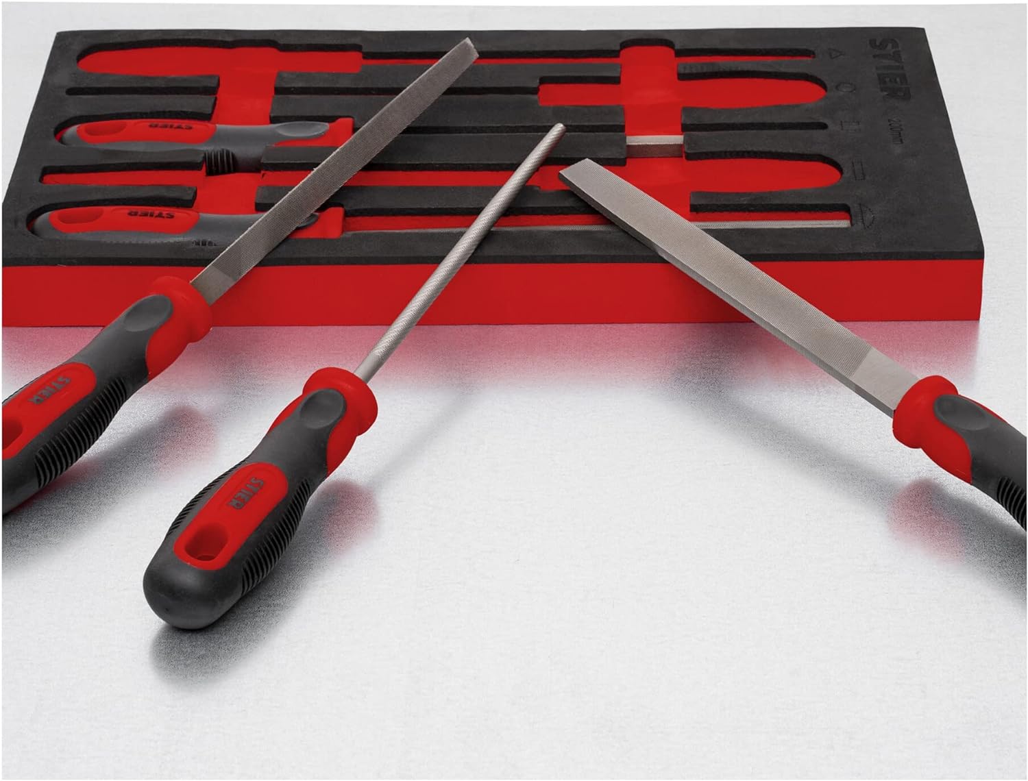 - PRAKTISCH: Die Feilen werden in einer hochwertigen EVA Weichschaumeinlage zur Platzierung in Werkbänken oder Werkstattwägen mit grosszügig ausgeschnittenen Lücken zur einfachen Entnahme des Werkzeuges geliefert. Sie kann beliebig mit anderen