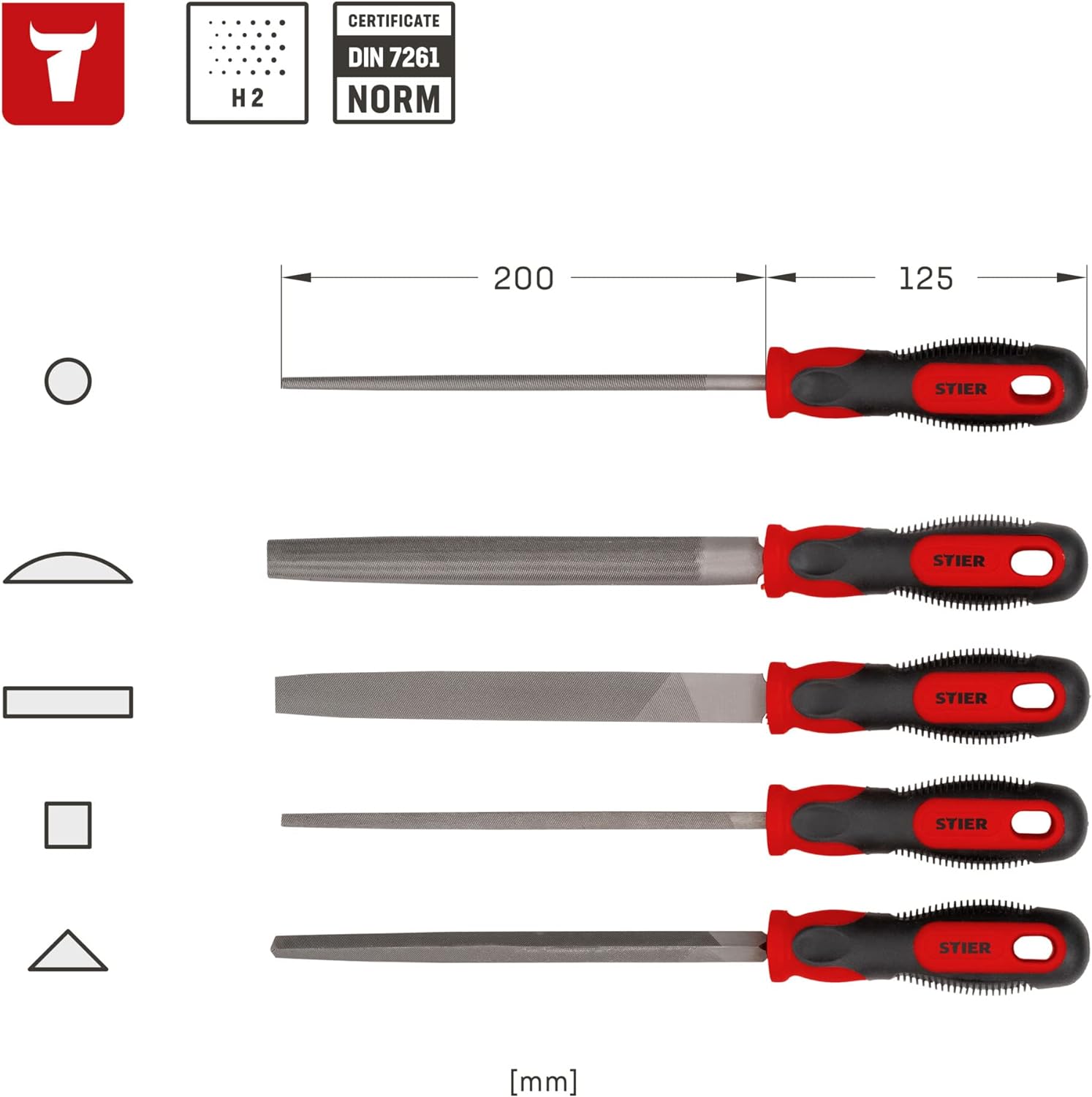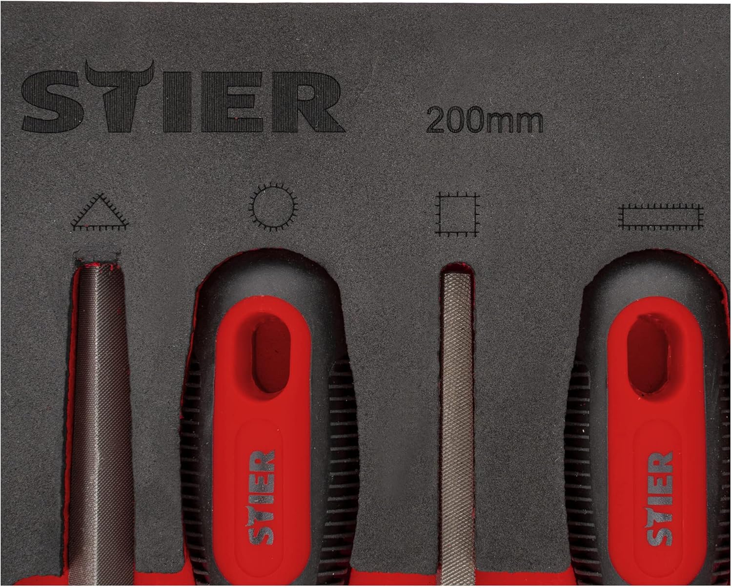 - "LIEFERUMFANG: 1 x STIER Flachstumpffeile, 200 mm, Hieb 2 1 x STIER Dreikantfeile, 200 mm, Hieb 2 1 x STIER Vierkantfeile, 200 mm, Hieb 2 1 x STIER Halbrundfeile, 200 mm, Hieb 2 1 x STIER Rundfeile, 200 mm, Hieb 2 1 x EVA Weichschaumeinlage"