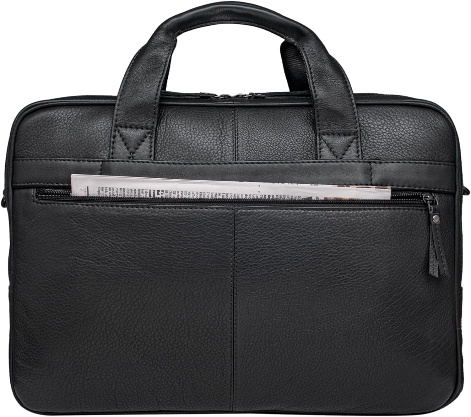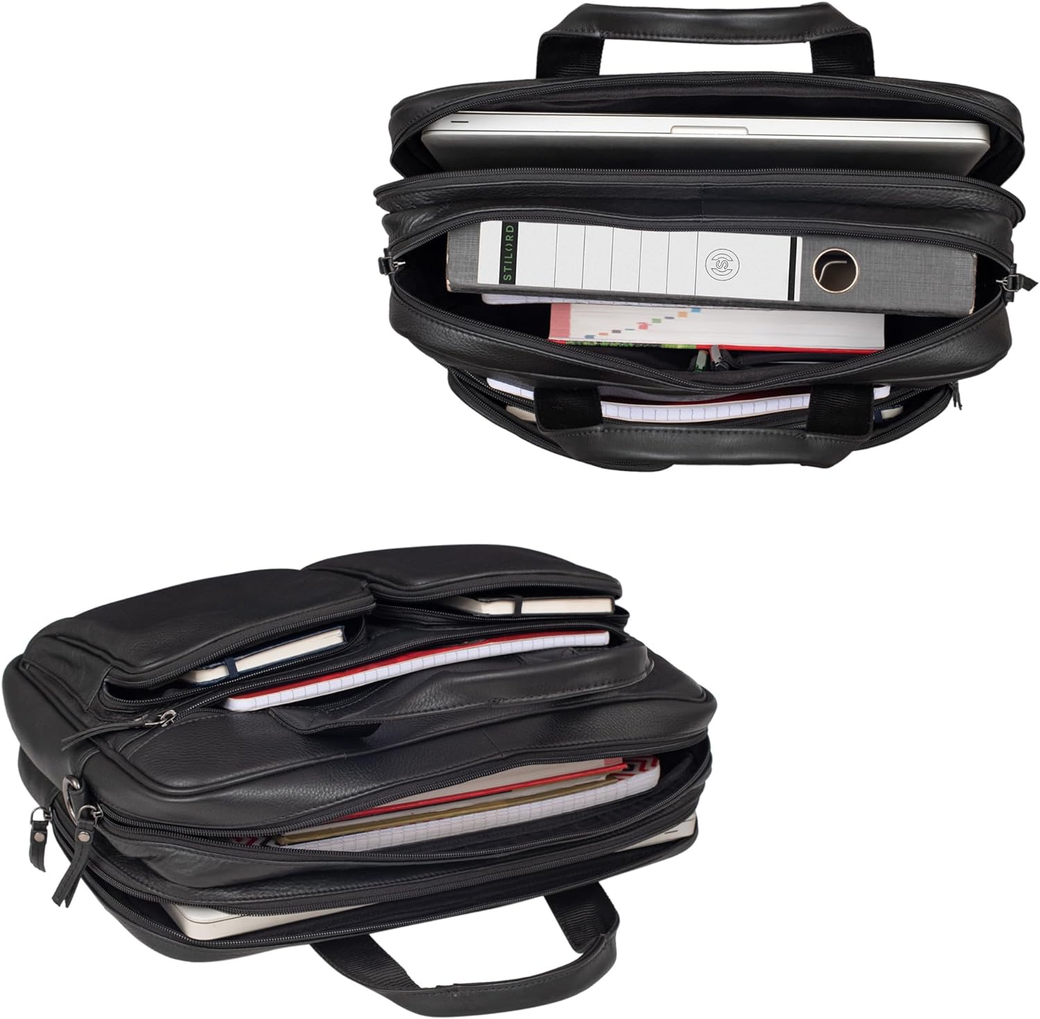 • AUF EINEN BLICK: Grosses Hauptfach für breite DIN A4 Ordner | Separates Laptopfach für 15 - 15,6 Zoll Notebook (38,5 x 29 cm) | Praktische Trolleyhalterung auf der Rückseite | Abmessungen (BxHxT): ca. 40 x 29 x 12 cm | Material: echtes Rindsleder |