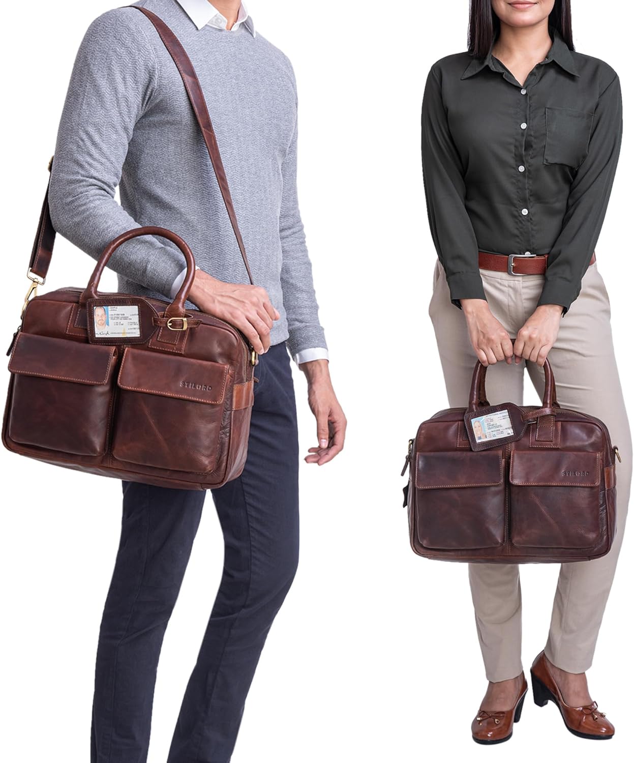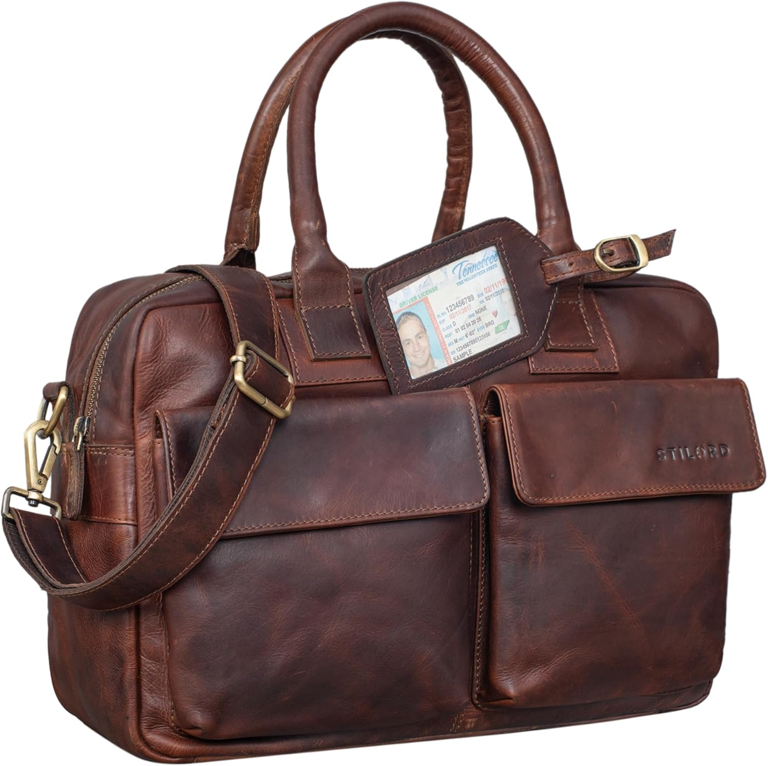 PRODUKTBESCHREIBUNGEN STILORD Grosse Umhängetasche Leder Lehrertasche Eine multifunktionelle, grosse und gleichzeitig elegante Ledertasche von STILORD. Beliebt ist die Tasche auch bei Lehrern, da das grosse Platzangebot eine strukturierte Aufbewahrung der Arbeitsmaterialien ermöglicht. In Beruf, Freizeit oder auch auf Reisen haben Sie dieser besonderen Umhängetasche viele Vorteile: Den Anfang macht der praktische Schultergurt, der längenverstellbar und abnehmbar ist. Alternativ tragen Sie das Lederunikat auch als Handtasche. Besonders praktisch ist das grosse, gepolsterte Laptopfach (40x22 cm) für MacBooks oder Notebooks (13 14 oder 15.6 Zoll). Hinzu kommt die praktische Organisationsleiste mit Stifthaltern, Portemonnaie bzw. Handy Fach und vier Kreditkartenhaltern. Alles Weitere in der Übersicht: Laptoptasche Leder Herren 15,6 Zoll - Highlights und Fakten - Tragemöglichkeit als Handtasche oder Umhängetasche - 1 x grosses Reissverschlussfach auf der Rückseite - 1 x längliches Fach mit Reissverschluss mit Einsteckfächern für Smartphone, Stifte und Kreditkarten - 1 x grosses Hauptfach, geeignet für Bücher oder grosse Aktenordner - Laptopfach für Geräte bis 15.6 Zoll - Masse ca. 40 x 22 cm | Polsterung & Klettverschluss zur Sicherung - jeweils 1 x Portemonnaie- und Schlüsselfach - elegantes Vintage Design - verstell- und abnehmbarer Schulterriemen (120 - 155 cm lang | 3,3 cm breit) - Abmessungen: 40 x 18 x 30 cm | Modell: Carlo | Material: echtes Büffel Leder | Hersteller: STILORD | Kompatibilität: Für 15,6 Zoll Laptops