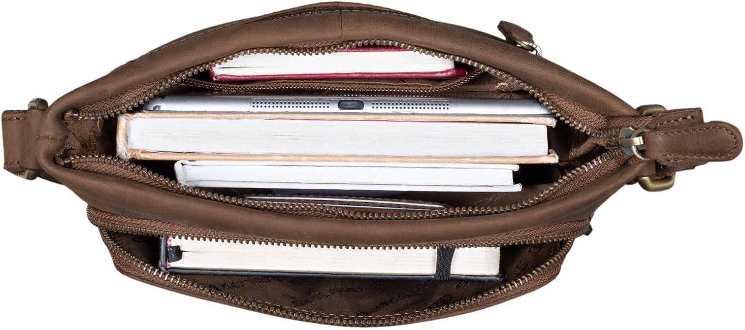 - FÜR JEDE SITUATION: Die schlichte Lederumhängetasche im Vintage Stil passt zu jedem Ihrer Outfits, ob am Mittag im Café oder abends in der Bar. Zudem bietet die Ledertasche ausreichend Platz für Portemonnaie und Handy sowie für ein 10.1 Zoll Tablet.