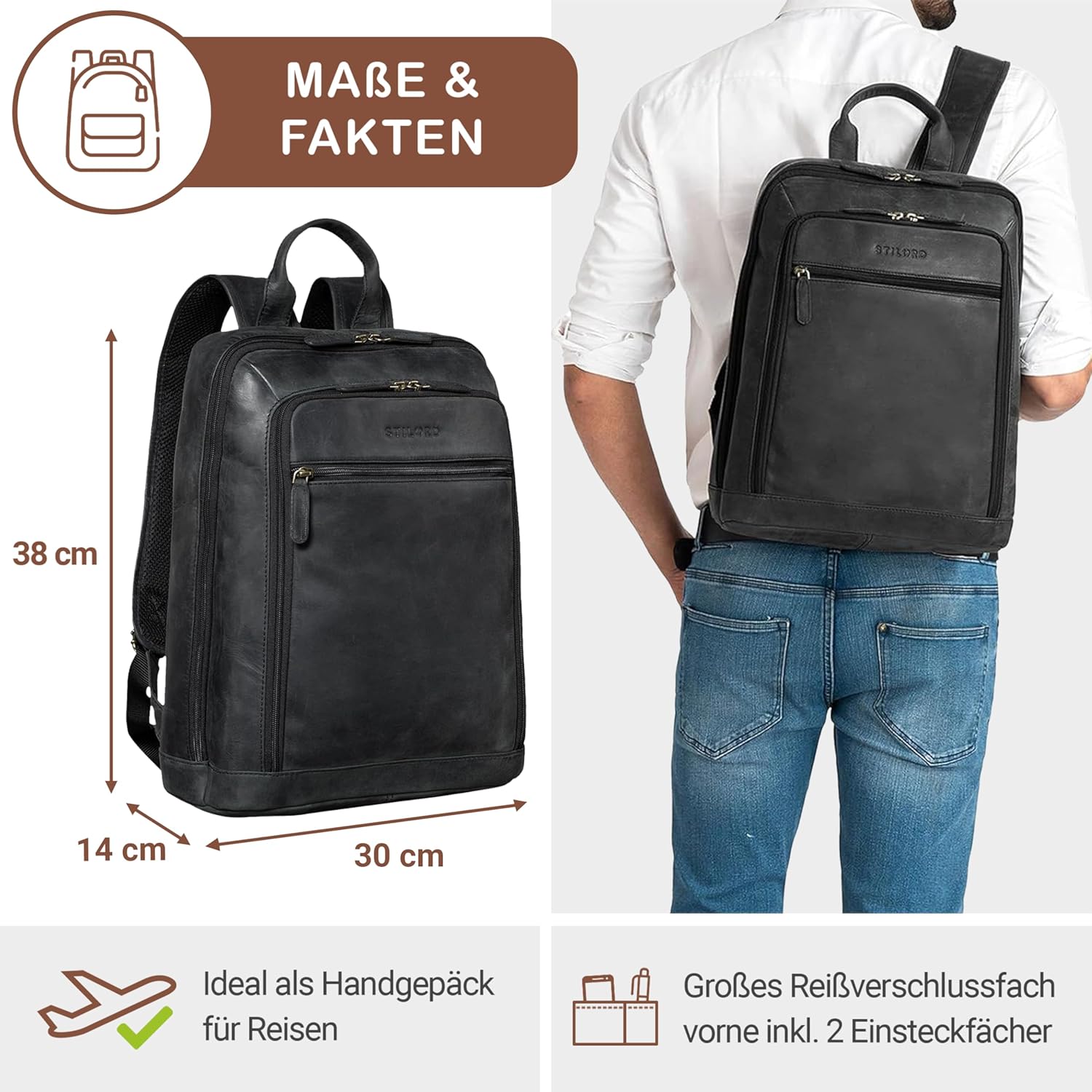 • ALLES AUF EINEN BLICK: Abmessungen: 30 x 14 x 38 cm | Gewicht: 1110 Gramm | Material: Rindsleder | Modell: Watson | Hersteller: STILORD | Kompatibilität: Separates Laptopfach für 15.6 Zoll Notebooks und 16 Zoll MacBooks mit maximalen Massen von 38,5 x