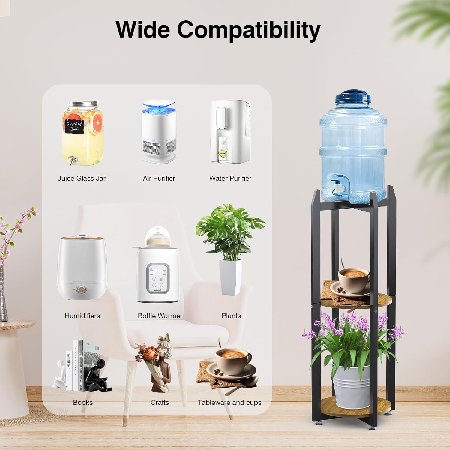 - 🌵Stabiler und standfester Standregal für 1-5 Gallonen Wasserspender, Wasserkrüge, Wasserfilter, Getränkespender, Wassertöpfe. Hochwertiger Metallrahmen und zwei flexible abgerundete Bretter, drei verschiedene Darstellungsmöglichkeiten, je