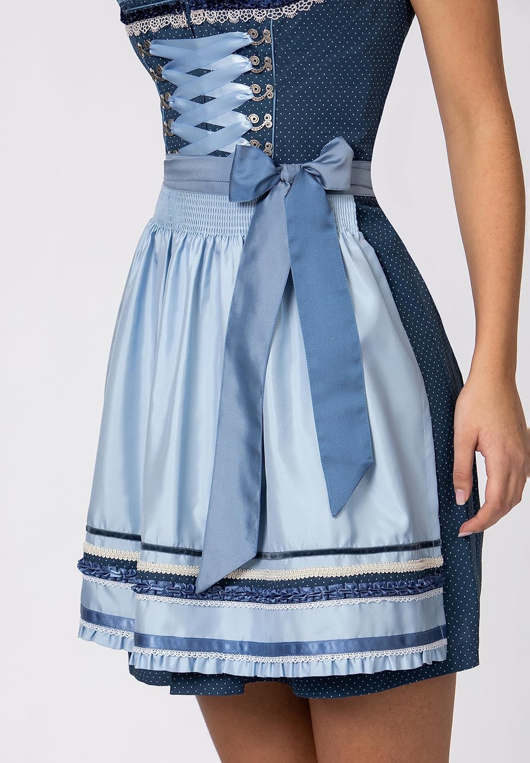 PRODUKTBESCHREIBUNGEN Dirndl Harper für Damen von Wiesnwuid. Das stilvolle Dirndl aus pflegeleichter Baumwolle begeistert durch den gedruckten Tupfen Allover und ist mit liebevollen Details versehen. Für die feminine Note sorgen die eingearbeiteten Rüschen am Ausschnitt, die aufgenähten Zierborten sowie die Miederhaken in altsilber. Edle Stoffe, beste Verarbeitung und der perfekte Schnitt machen dieses geschmackvolle Modell zu deinem ganz persönlichen Schmuckstück. Die Schnürung aus einem farbig passenden Satinband unterstreicht das Design. Durch die hochwertige, farblich abgestimmte Schürze mit Zierborten wird das Gesamtbild gekonnt abgerundet. Ein absolutes Highlight für jede Dirndlträgerin.
