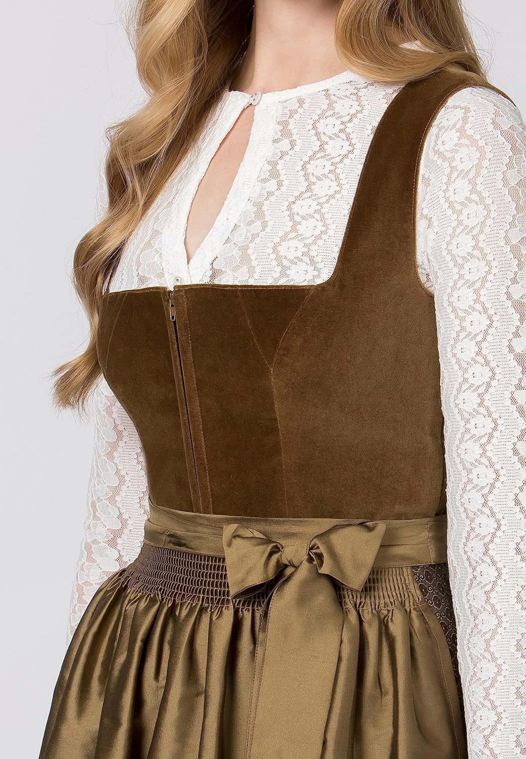 PRODUKTBESCHREIBUNGEN Dirndl Isola von Heimatgwand in olive. Das edle Modell überzeugt durch den exklusiven, hochwertigen Samt und ist mit liebevollen Details versehen. Der gerade Münchener Schnitt zaubert ein schönes Dekolleté. Das stilvolle Mieder wird dezent mit einem Reissverschluss geschlossen und rundet den gesamten Look ab. Die farblich abgestimmte Schürze und der Rock aus exquisitem Jacquard unterstreichen die feminine Passform. Ein absolutes Muss für jeden Trachtenfan. Kombipartner: Trachtenbody Dani in creme.