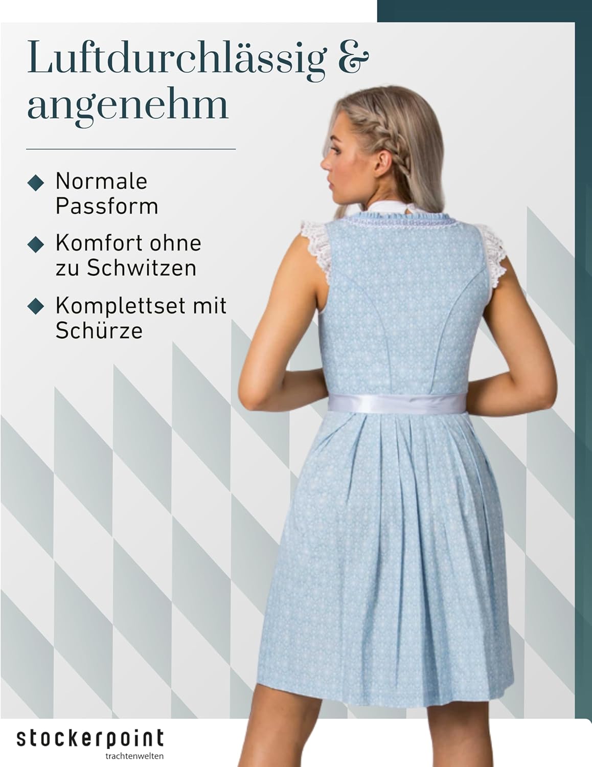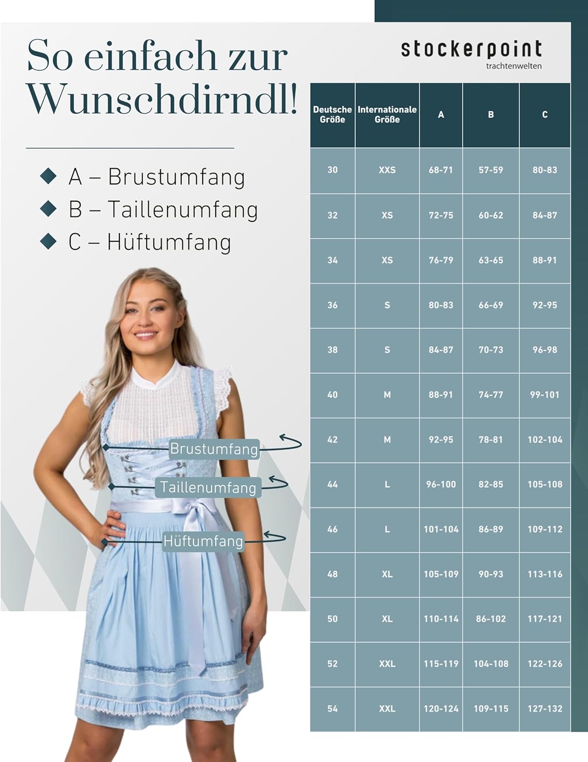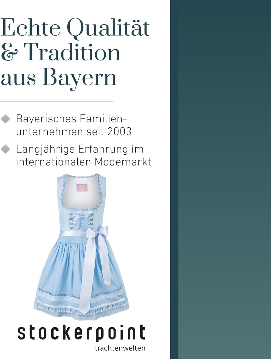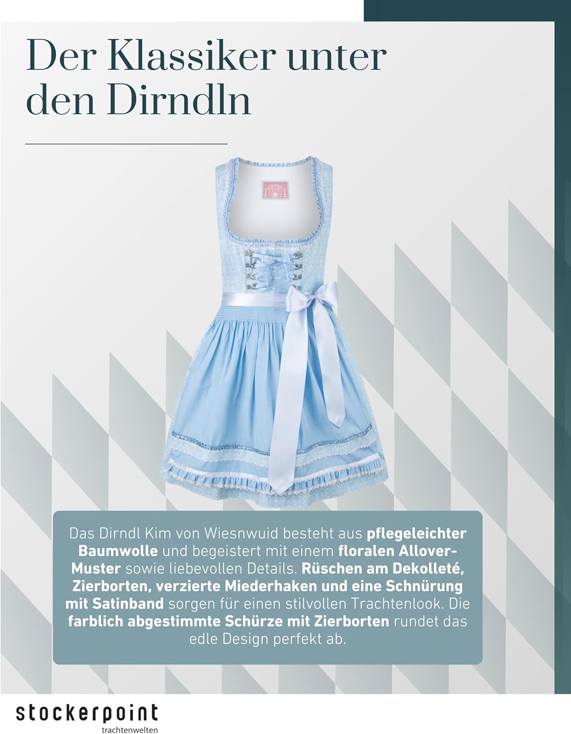 PRODUKTBESCHREIBUNGEN Dirndl Kim für Damen von Wiesnwuid. Das edle Dirndl aus pflegeleichter Baumwolle verzaubert durch das florale gedruckte Allover Muster und ist mit liebevollen Details versehen. Für den trendigen Trachten Look sorgen die eingearbeiteten Rüschen am Dekolleté, die aufgenähten Zierborten sowie die verzierten Miederhaken. Die Schnürung mit farbigem Satinband unterstreicht dieses stilvolle Design. Durch die hochwertige, farblich abgestimmte Schürze mit Zierborten wird das Gesamtbild gekonnt abgerundet. Ein Lieblingsstück für viele Gelegenheiten.