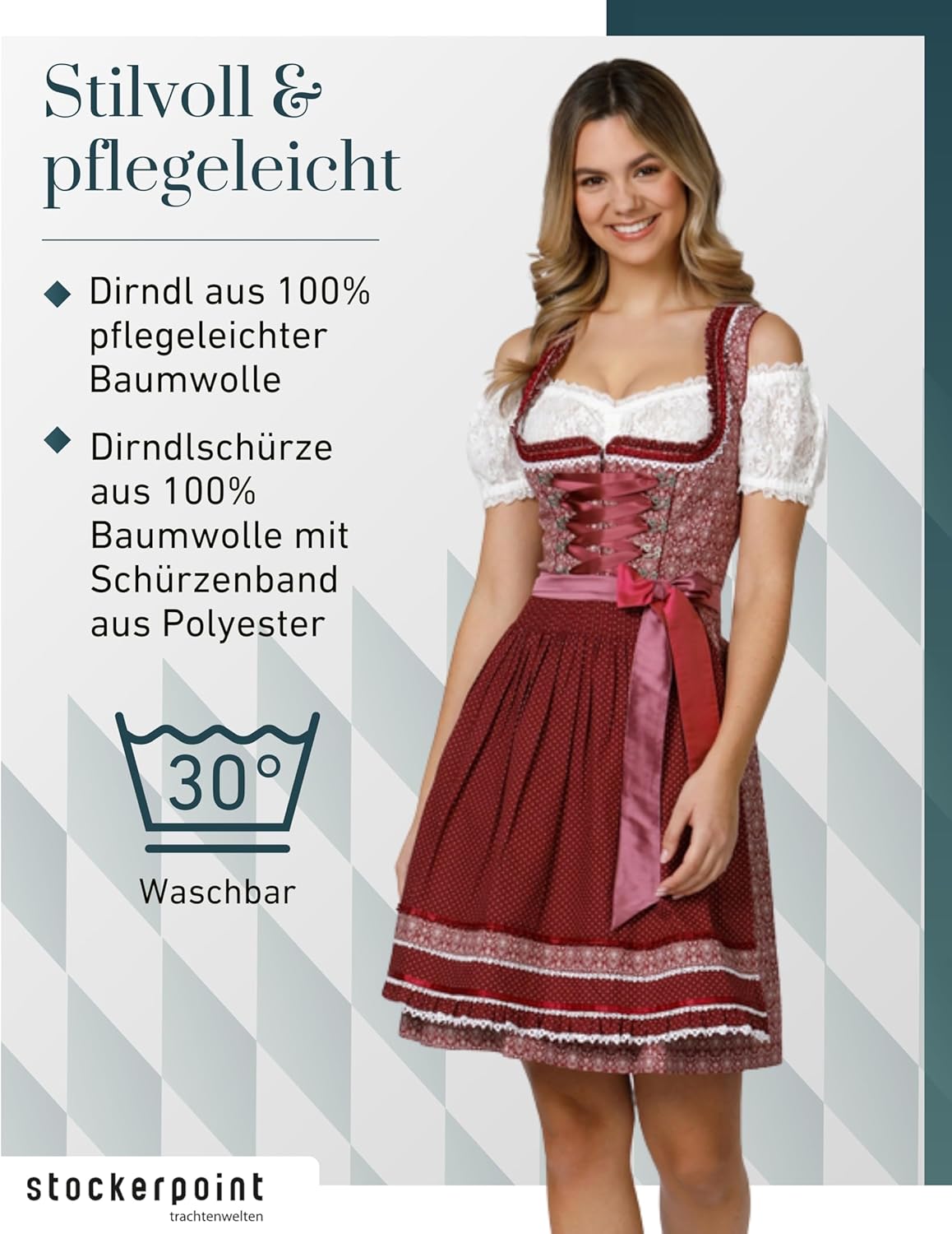 - Dirndl Kim für Damen von Wiesnwuid. Das edle Dirndl aus pflegeleichter Baumwolle verzaubert durch das florale gedruckte Allover Muster und ist mit liebevollen Details versehen. Für den trendigen Trachten Look sorgen die eingearbeiteten Rüschen am