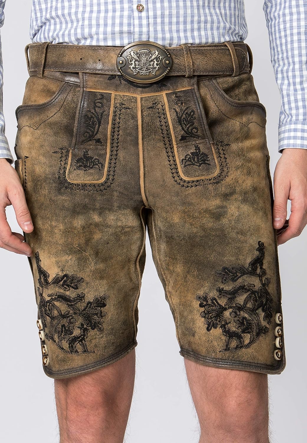 PRODUKTBESCHREIBUNGEN Herrenlederhose Hartl kurz von Stockerpoint Die Lederhose aus hochwertig gegerbten Wildbock-Leder in Hirschoptik zeichnet sich durch den ausgefallenen Vintage-Look aus Die nach alten Vorbildern gefertigte Stickerei harmoniert perfekt mit den Knöpfen in Hirschhorn-Optik Die aussergewöhnliche Strukturierung des Leders mit antiken Farbverläufen verleiht dem Modell eine einzigartige Note Dank Schnürung an Bund-Rückseite kann die Lederhose in der Weite angepasst werden Die Hose wird mit Gürtel geliefert Typisch ist die auswechselbare zweifarbige Schliesse in messing und altsilber Mehr