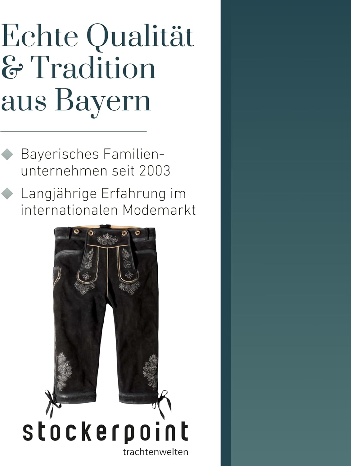 PRODUKTBESCHREIBUNGEN Herrenlederhose Justin4 Kniebund von Stockerpoint Die Lederhose aus hochwertig gegerbtem Ziegenleder zeichnet sich durch die aussergewöhnliche antike Strukturierung aus und harmoniert perfekt mit den Knöpfen in Hirschhorn-Optik Die trendige Relief-Stickerei entsteht durch gekonnte Handarbeit und verleiht dem Modell ihren einzigartigen Charakter Dank Schnürung an Bund-Rückseite kann die Lederhose in der Weite angepasst werden Der geschnürte Bund am Beinabschluss lässt sich individuell verstellen Die Hose wird mit Träger geliefert