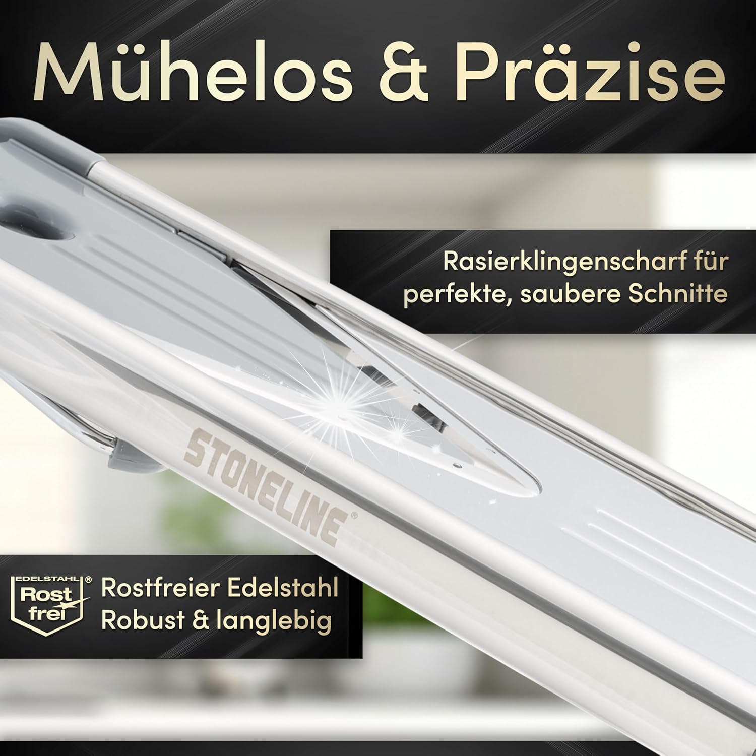 - Lieferumfang: 1 x STONELINE V-Hobel, 39,5 x 13,1 cm; 1 x Klingenschutz, 5 x Schneideinsätze, 1 x Fingerschutz Halter, 1 x Aufbewahrungsständer für Schneideinsätze; Material: Edelstahl