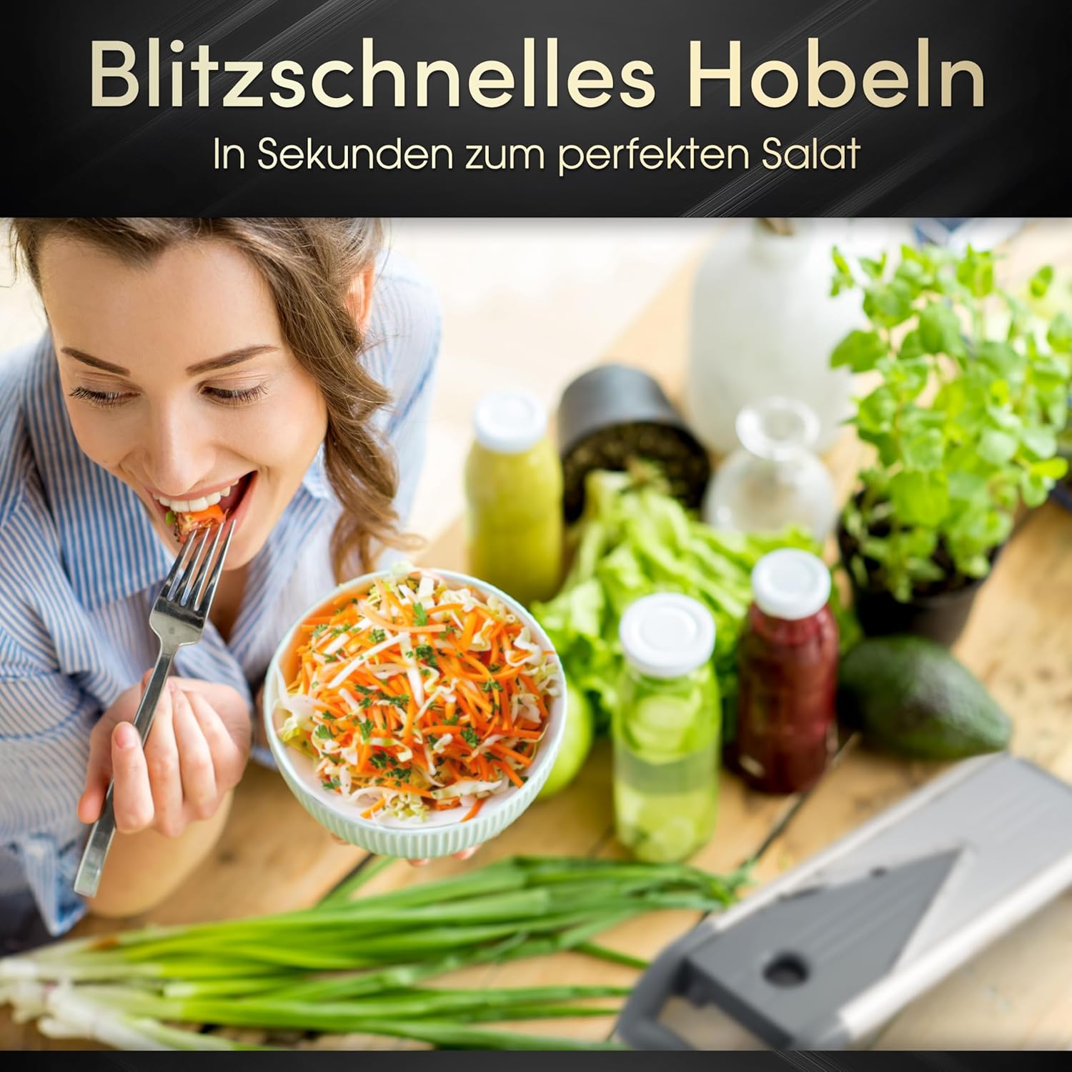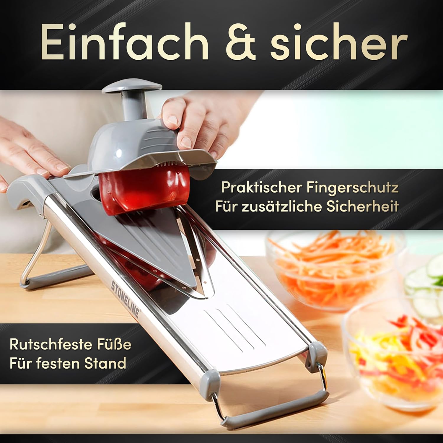 - STONELINE V-Hobel für ein sicheres Schneiden und Hobeln von Gemüse und Obst: Der Fingerschutz-Halter sorgt für einen festen Halt und das einfache Wechseln der verschiedenen Schneideinsätze. Das Schnittgut kann fast restlos verarbeitet werden