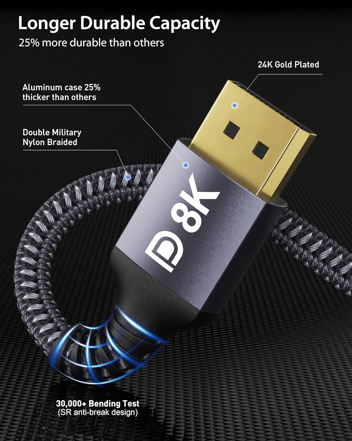 - 【Spielerfreundlich】 Das Stouchi 8k DisplayPort Kabel ist die beste Wahl für grosse FPS-Spiele und Ultra HD Video Streaming. Unterstützt FreeSync und G-Sync auf Ihrer NVIDIA- oder AMD-Grafikkarte. Mit der hohen Bildwiederholfrequenz von 4K@144 Hz