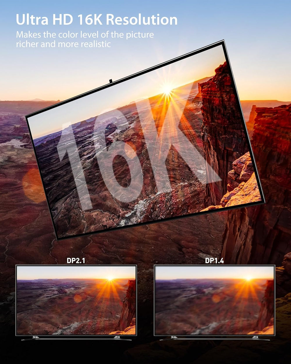 - 【Unterstützt 16K@60Hz UHD-Auflösung】Stouchi Displayport Cable 2.1 unterstützt 16K(15360x8640)@60Hz,10K(10240×4320)@60Hz,8K(7680x4320)@120Hz,4K(3840x2160)@240Hz/165Hz/144Hz hohe Auflösung. Ideal für grosse Spiele und Ultra-HD-Video-Streaming.