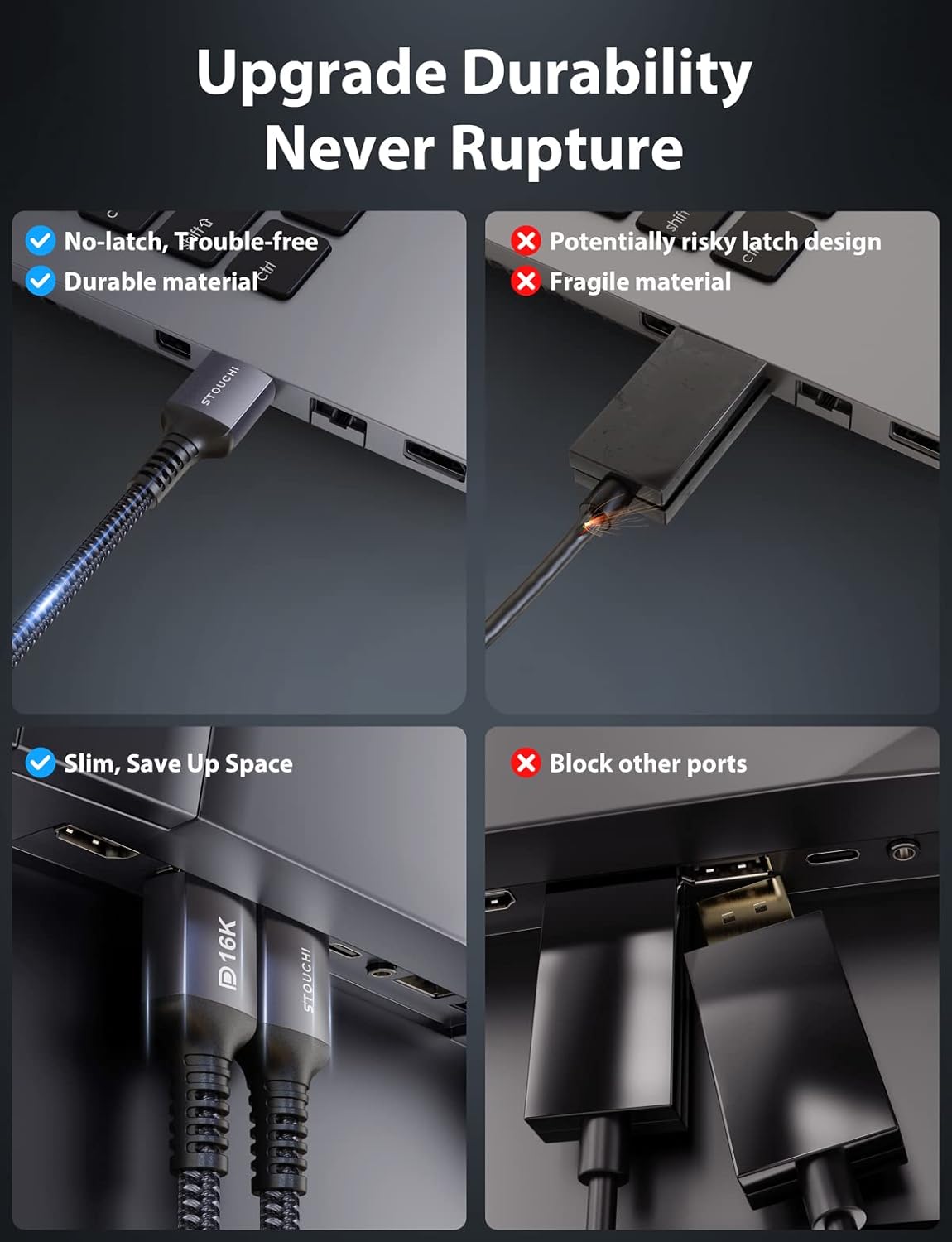 - 【Unterstützt 16K@60Hz UHD-Auflösung】Stouchi Displayport Cable 2.1 unterstützt 16K(15360x8640)@60Hz,10K(10240×4320)@60Hz,8K(7680x4320)@120Hz,4K(3840x2160)@240Hz/165Hz/144Hz hohe Auflösung. Ideal für grosse Spiele und Ultra-HD-Video-Streaming.