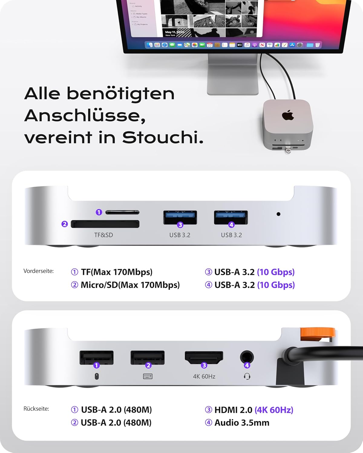 - Volle Konnektivität in einem Dock: Das Stouchi M4 Mac mini Dock verfügt über 2× USB A 3.2 (10 Gbit/s), 2× USB A 2.0, SD/TF Kartenleser (170 Mbit/s), einen 4K@60Hz HDMI Anschluss und eine 3,5 mm Audiobuchse. Schliessen Sie Laufwerke, Displays und