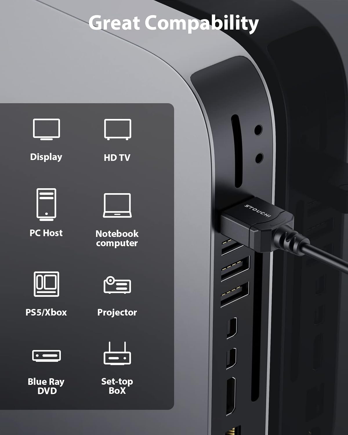 - [Universelle Kompatibilität]: Stouchi 8K Slim HDMI 2.1-Kabel ist kompatibel mit Ihren Streaming-Geräten, Apple TV, NIV DIA SHI ELD TV, CD/DVD/Blu-ray-Playern, Roku Ultra, PS5, PS4, PS3, Xbox One/360 , Nin tendo Switch, Computer oder andere HDMI-fähige