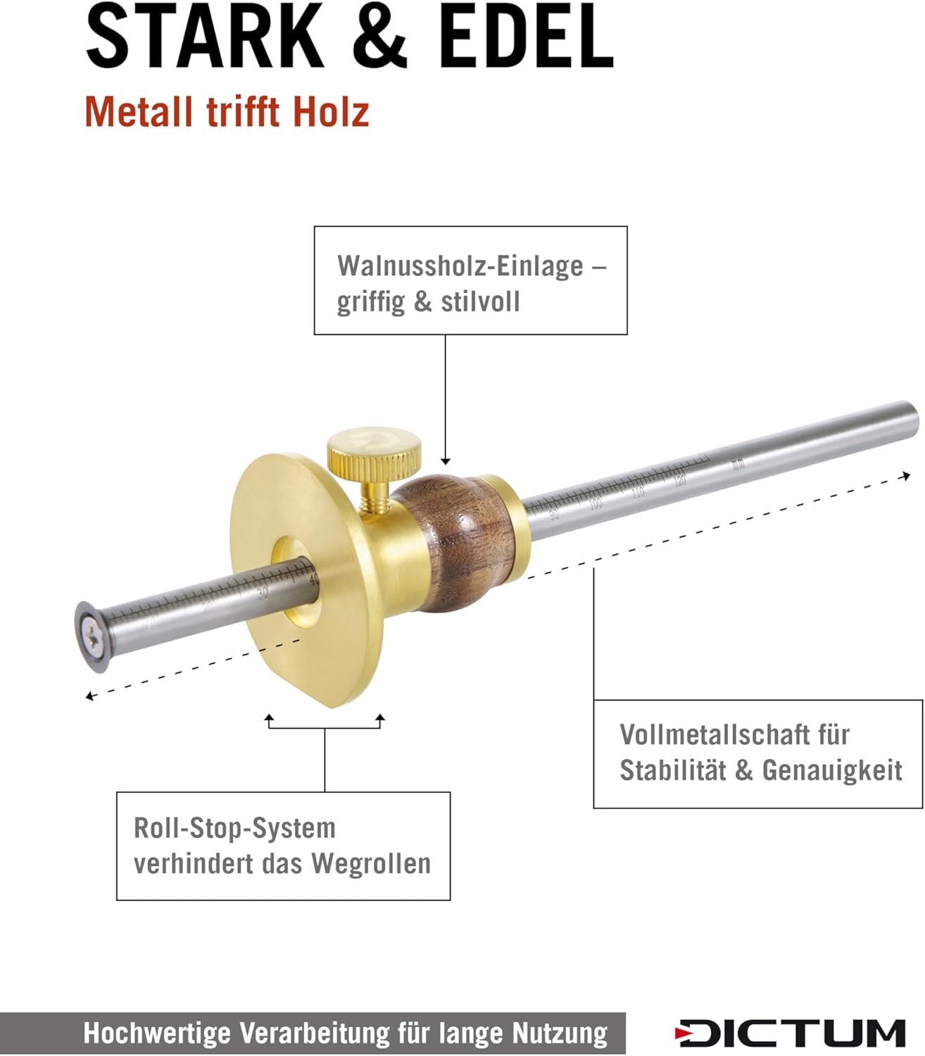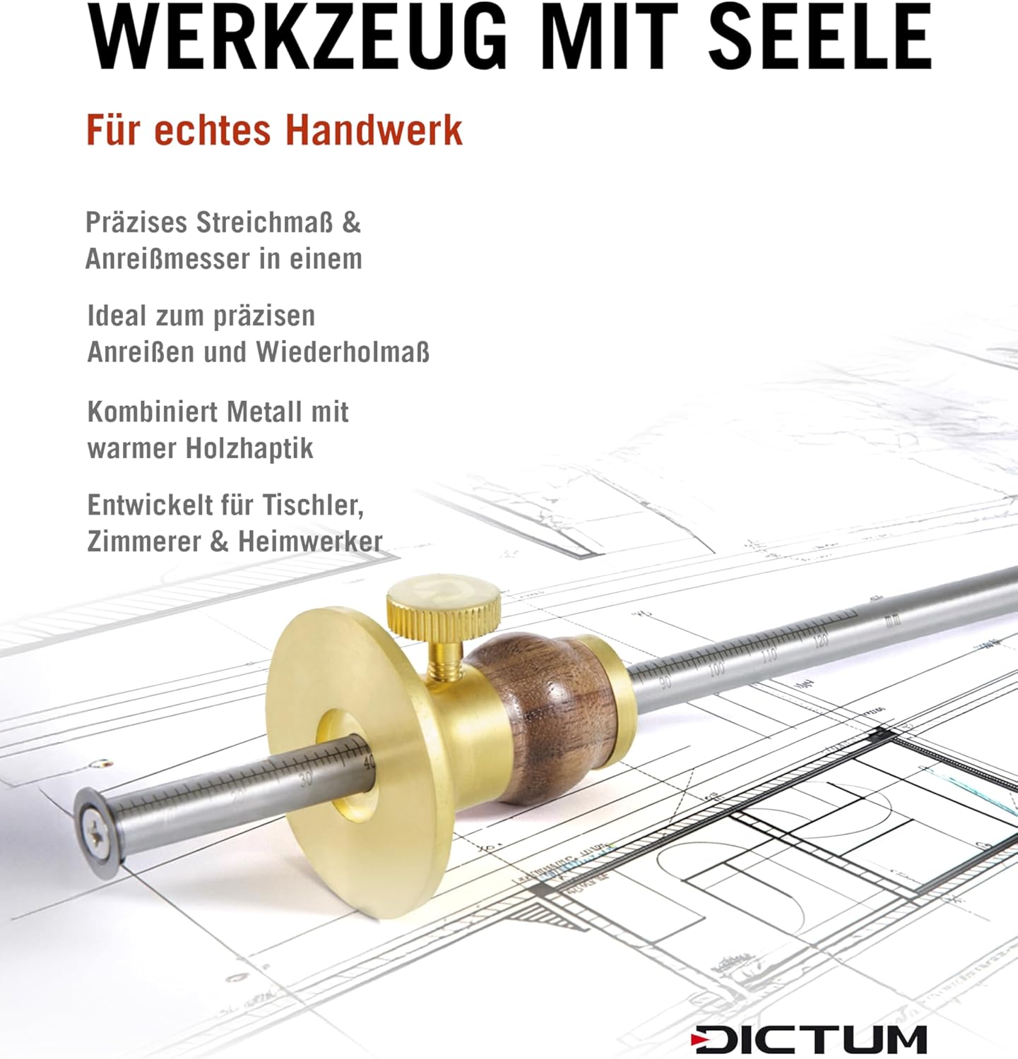 PRODUKTBESCHREIBUNGEN DICTUM Streichmass Bereits im 19. Jahrhundert fertigten englische Werkzeughersteller ein Streichmass mit rundem Metallschaft, um Zapfenlöcher und Materialstärken noch präziser anreissen zu können. Unser Streichmass besticht neben einer hohen Anreissgenauigkeit auch durch eine ballige Holzeinlage für einen warmen, ergonomischen Griff. Um bei unregelmässigem Faserverlauf ein Verlaufen zu vermeiden, ist der Anreisskopf als Rundmesser ausgeführt. Eine tiefgeätzte Schaftskala zum schnellen Einstellen sowie die Rollstopp-Fläche am Messinganschlag komplettieren dieses hochwertige Anreisswerkzeug. Gehärteter Metallschaft. Arbeitsbereich: 0–150 mm Länge: 185 mm DICTUM DICTUM schafft voller Überzeugung Produkte mit langer Lebensdauer. Sie sind frei von umwelt- oder gesundheitsschädlichen Stoffen. Seit über 170 Jahren gilt die Unternehmensphilosophie für unsere Produkte: * Höchste funktionale Ästhetik * Hoher Anspruch an Ergonomie * Beste Materialien * Langjährige Geschäftsbeziehungen zu Herstellern und Lieferanten * Langlebigkeit der Produkte durch umfangreichen Service wie Schärfservice Einstielservice Ersatzteil-Service Auf eine ehrliche und professionelle Zusammenarbeit mit unseren Partnern und Herstellern legen wir grossen Wert. DICTUM ist mehr als Werkzeug…