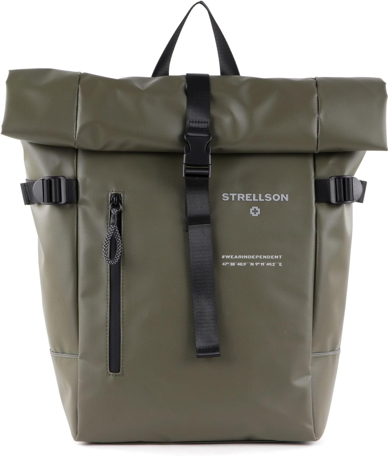 PRODUKTBESCHREIBUNGEN Sportliches Design trifft auf viel Platz: Dieser wasserabweisende Rucksack von Strellson lässt Sie und Ihre Utensilien nicht im Regen stehen. * moderner, unkomplizierter Kurierrucksack * aus wasserdichter Plane gefertigt * im lässig-sportlichen Design mit viel Platz * grosses Hauptfach, passend für A4-Ordner, schliesst mit wasserabweisendem Reissverschluss, Rollverschluss und verstellbarem Steckverschluss * innen ein Laptopfach mit Klettlasche, ein Reissverschlussfach, 2 Einsteckfächer und 2 Stiftschlaufen * ein vertikales Fach mit wasserabweisendem Reissverschluss auf der Front * je ein verstellbarer Kompressionsriemen an der Seite * ein Fach unten auf der Rückseite schliesst mit wasserabweisendem Reissverschluss * textile Trageschlaufe * verstellbare, Mesh-gepolsterte Tragegurte * Mesh-gepolsterter Rücken mit Trolleyhalterung * leicht verstärkter Boden und stabiler Stand * reflektierende Details Mehr