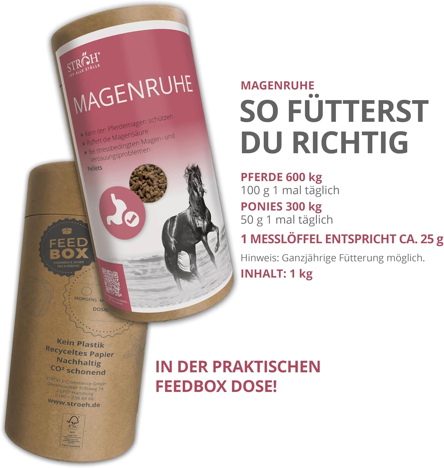 - FÜTTERUNGSEMPFEHLUNG - DOPINGFREI - Täglich je nach Bedarf je Pferd 50 - 100g STRÖH MAGENRUHE für Pferde als Ergänzungsfuttermittel mit Kraftfutter oder Müsli verfüttern. Die "Magenruhe" kann ohne Probleme auch mit Mash verfüttert werden. Dies