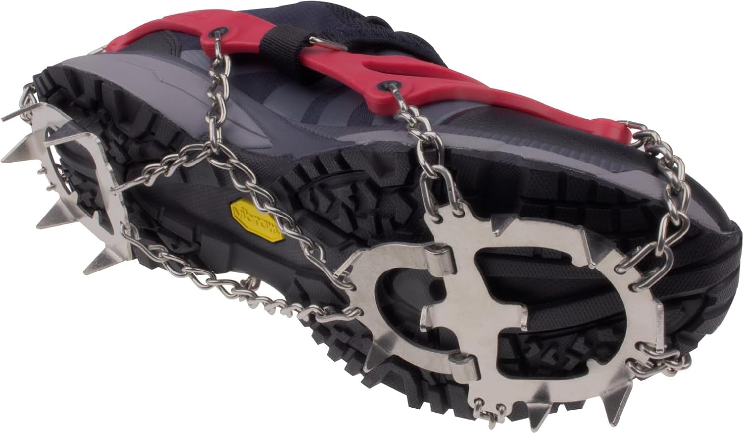 - Ausgestattet mit 14-zackigen geschmiedeten hufeisenförmigen Unterteil aus Edelstahl pro Fuss und einem robusten Kettensystem bieten die Grödel eine hervorragende Traktion auf vereisten und verschneiten Untergrund