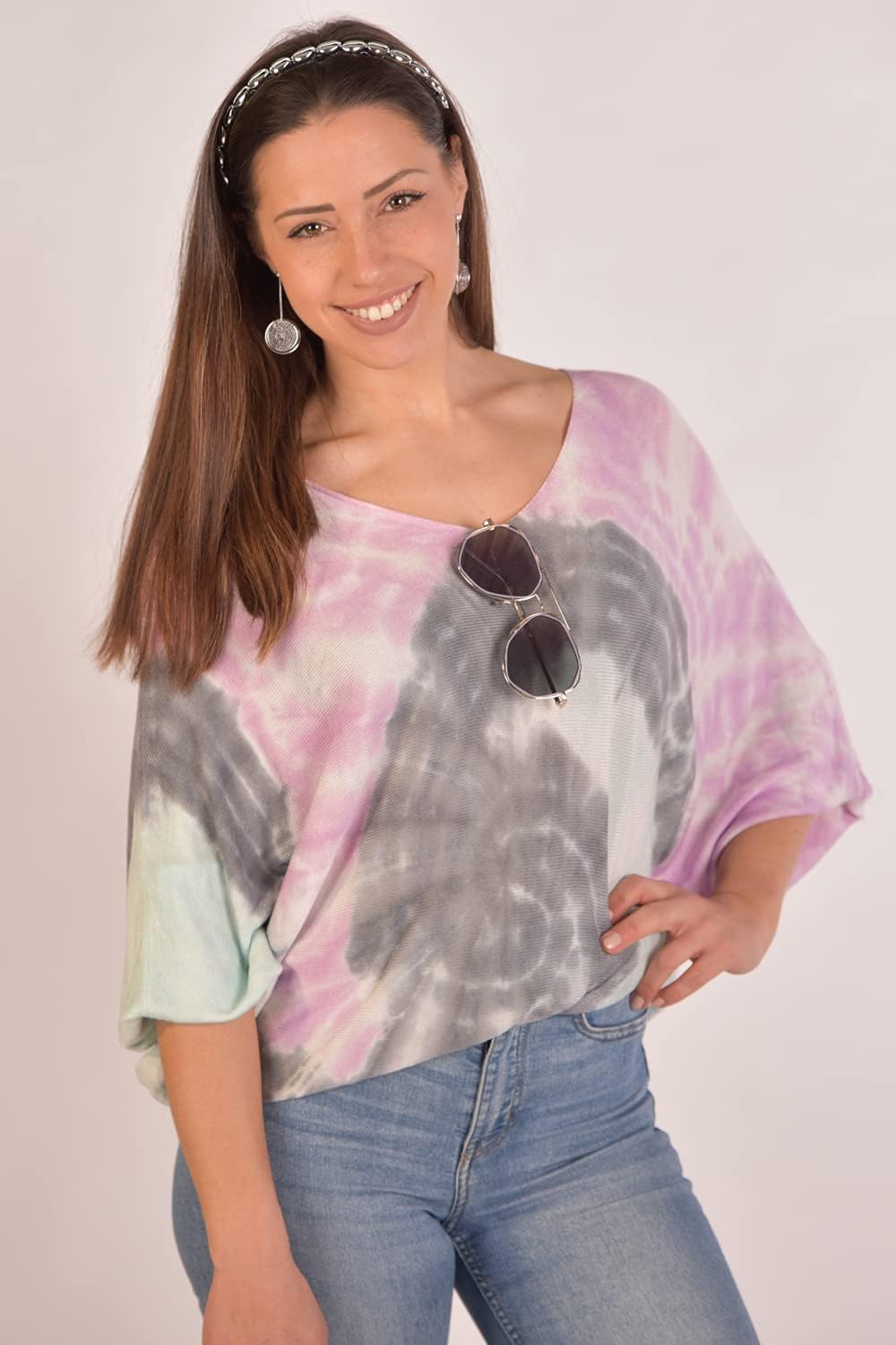 PRODUKTBESCHREIBUNGEN styleBREAKER leichter Feinstrick Poncho mit 3/4 Fledermausärmel und V-Ausschnitt in sommerlichem buntem Batik Muster. - leichter Feinstrick Poncho im angesagten Batik Muster - weiter V-Ausschnitt (Kragenweite ca. 32 cm) - 3/4 Fledermausärmel mit Bündchen - Ärmel- und Saumabschluss gerippt - elastisches Material und lockere Figur umschmeichelnde Passform - Einheitsgrösse für Erwachsene (One Size) - der leichte Sommer Poncho kann von Grösse 34 bis 42 locker getragen werden - Länge ab Kragen ca. 71 cm (vorne und hinten) - Ärmellänge ab Kragen seitlich ca. 61 cm - angenehmer Tragekomfort - sehr weiches, angenehm zu tragendes Material - Material: 88% Viskose / 12% Nylon - waschbar bei 30°C Unser Model ist 170 cm gross und hat Konfektionsgrösse 34/36