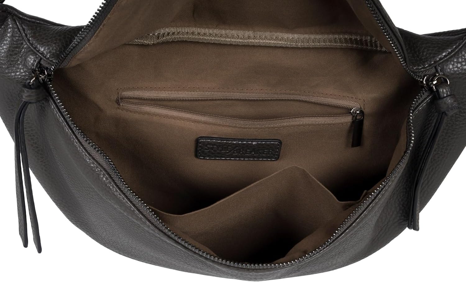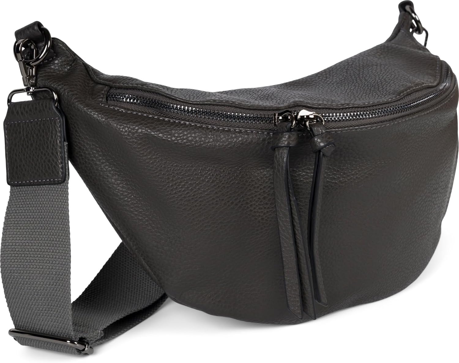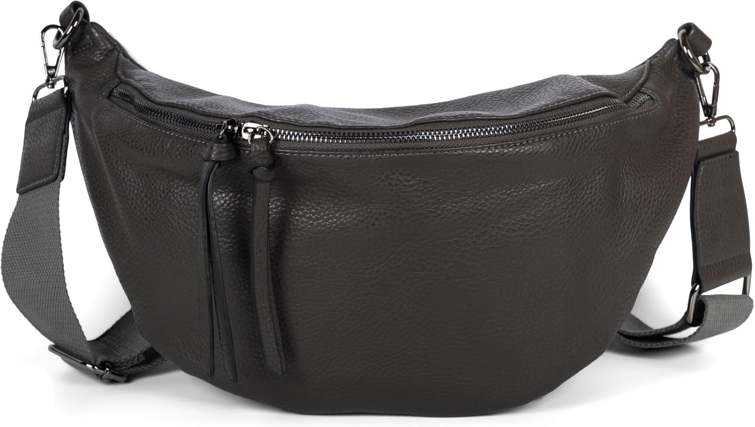 PRODUKTBESCHREIBUNGEN styleBREAKER Einfarbige Grosse Halbmond Crossbody Schultertasche aus fein strukturiertem Kunstleder mit abnehmbarem und verstellbarem Schultergurt Die edle Halbmond Förmige Handtasche, die sowohl als Crossbody Bag, als auch als Schultertasche oder Umhängetasche getragen werden kann, rundet dein Outfit optimal ab. Die Tasche wird über einen 2-Wege Reissverschluss geschlossen und bietet als Extra Stauraum noch ein Reissverschluss Fach auf der Rückseite. Das Hauptfach der Crossbag bietet genügend Platz für Portemonnaie, Schlüssel, Smartphone und Kleinigkeiten, die man unterwegs immer Griffbereit haben möchte. Der breite einfarbige Schultergurt aus hochwertig gewebtem Stoff kann über Karabiner abgenommen und gegen einen bunten Wechsel Taschengurt ausgetauscht werden. So verleihst du deiner Unifarbenen Umhängetasche jederzeit einen Individuellen Style und kannst sie für jeden Anlass neu Stylen. - Modisches Einfarbiges Design mit fein strukturierter Kunstleder Oberfläche - Abnehmbarer und Längenverstellbarer Schultergurt mit Karabiner zum einfachen austauschen - Breites Gurtband aus hochwertig gewebtem Material mit Kunstleder gesäumte Gurtenden für mehr Stabilität - Hauptfach mit 2-Wege Reissverschluss - Reissverschluss Fach auf der Rückseite der Tasche - Die Handtasche kann als Umhängetasche, Schultertasche oder Crossbag getragen werden - Material: Material aussen: 100% Polyurethan Material innen: 80% Nylon / 20% Baumwolle - Masse B/H/T: ca. 37 x 17 x 10 cm - Breite Gurtband: ca. 5 cm - Schultergurt verstellbar von ca. 71 bis 128 cm - Ausstattung: Hauptfach mit 2-Wege Reissverschluss Innen 1 Steckfach, 1 Reissverschluss Seitenfach 1 Reissverschluss Fach Hinten Der Inhalt der Produktbilder dient nur zur Veranschaulichung und ist