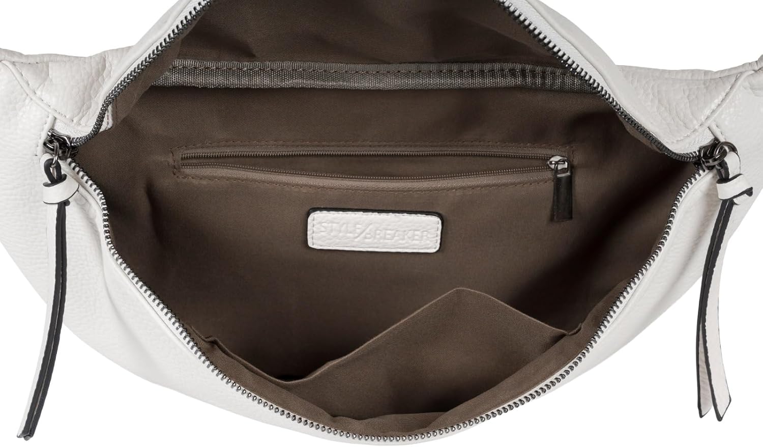 PRODUKTBESCHREIBUNGEN styleBREAKER Einfarbige Grosse Halbmond Crossbody Schultertasche aus fein strukturiertem Kunstleder mit abnehmbarem und verstellbarem Schultergurt Die edle Halbmond Förmige Handtasche, die sowohl als Crossbody Bag, als auch als Schultertasche oder Umhängetasche getragen werden kann, rundet dein Outfit optimal ab. Die Tasche wird über einen 2-Wege Reissverschluss geschlossen und bietet als Extra Stauraum noch ein Reissverschluss Fach auf der Rückseite. Das Hauptfach der Crossbag bietet genügend Platz für Portemonnaie, Schlüssel, Smartphone und Kleinigkeiten, die man unterwegs immer Griffbereit haben möchte. Der breite einfarbige Schultergurt aus hochwertig gewebtem Stoff kann über Karabiner abgenommen und gegen einen bunten Wechsel Taschengurt ausgetauscht werden. So verleihst du deiner Unifarbenen Umhängetasche jederzeit einen Individuellen Style und kannst sie für jeden Anlass neu Stylen. - Modisches Einfarbiges Design mit fein strukturierter Kunstleder Oberfläche - Abnehmbarer und Längenverstellbarer Schultergurt mit Karabiner zum einfachen austauschen - Breites Gurtband aus hochwertig gewebtem Material mit Kunstleder gesäumte Gurtenden für mehr Stabilität - Hauptfach mit 2-Wege Reissverschluss - Reissverschluss Fach auf der Rückseite der Tasche - Die Handtasche kann als Umhängetasche, Schultertasche oder Crossbag getragen werden - Material: Material aussen: 100% Polyurethan Material innen: 80% Nylon / 20% Baumwolle - Masse B/H/T: ca. 37 x 17 x 10 cm - Breite Gurtband: ca. 5 cm - Schultergurt verstellbar von ca. 71 bis 128 cm - Ausstattung: Hauptfach mit 2-Wege Reissverschluss Innen 1 Steckfach, 1 Reissverschluss Seitenfach 1 Reissverschluss Fach Hinten Der Inhalt der Produktbilder dient nur zur Veranschaulichung und ist