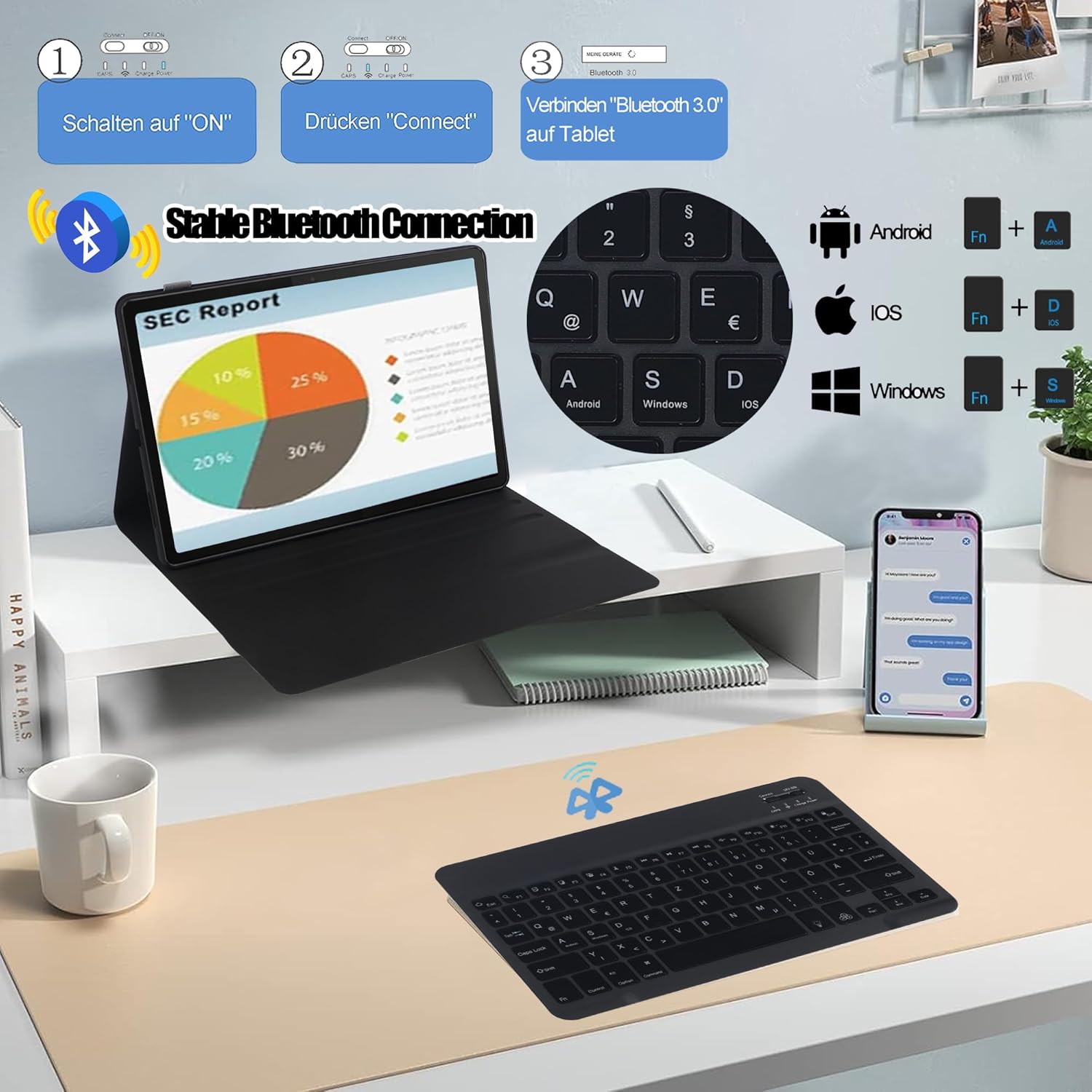 - STABILE BLUETOOTH VERBINDUNG: schnelle Eingabe Antwort, keine Verzögerung bei der Übertragung und kein Verlust von Zeichen. Schnelle Verbindung (3-5 Sekunde) und 10M Übertragungsdistanz.