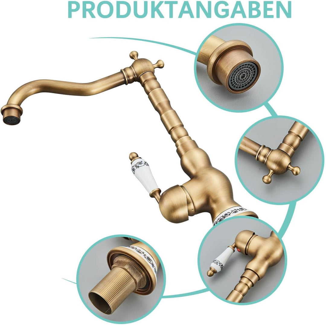 - Retro Bad Wasserhahn: Der Waschtischmischer besteht aus H59A-Messing und antikem Messing, ist gesund und langlebig;Griff und Grundmaterial ist Keramik, luxuriös.