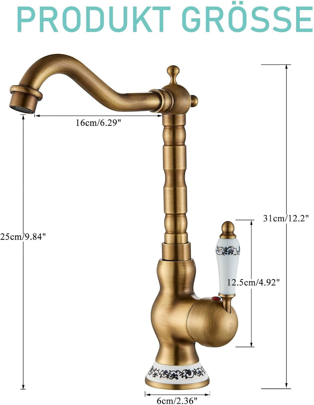 - Antik Waschtischarmatur: Abmessungen:Höhe des Wasserhahns: 31 cm; Höhe des Auslaufs: 25.3cm; Reichweite des Auslaufs: 16.2 cm;LochDurchmesser: 3.2 ~ 4.5cm.