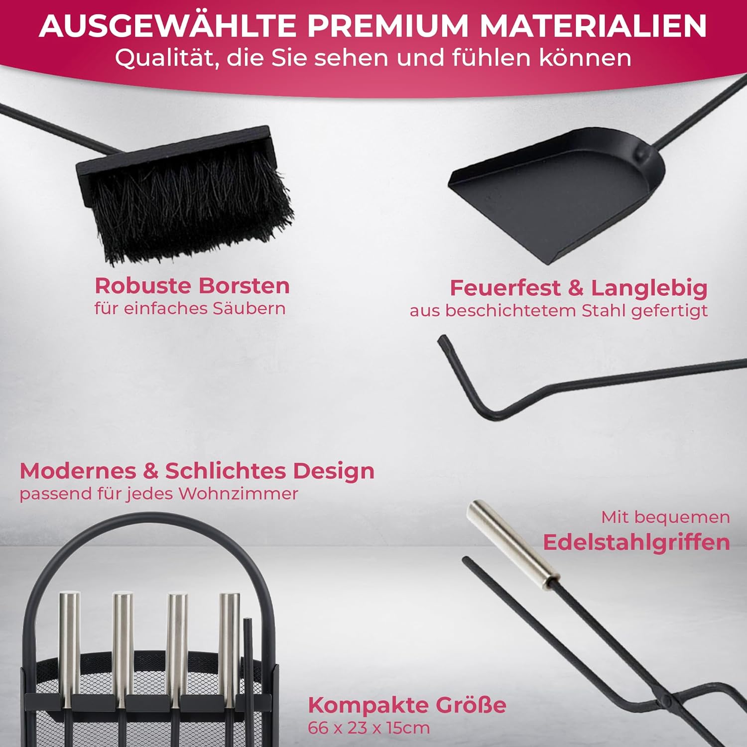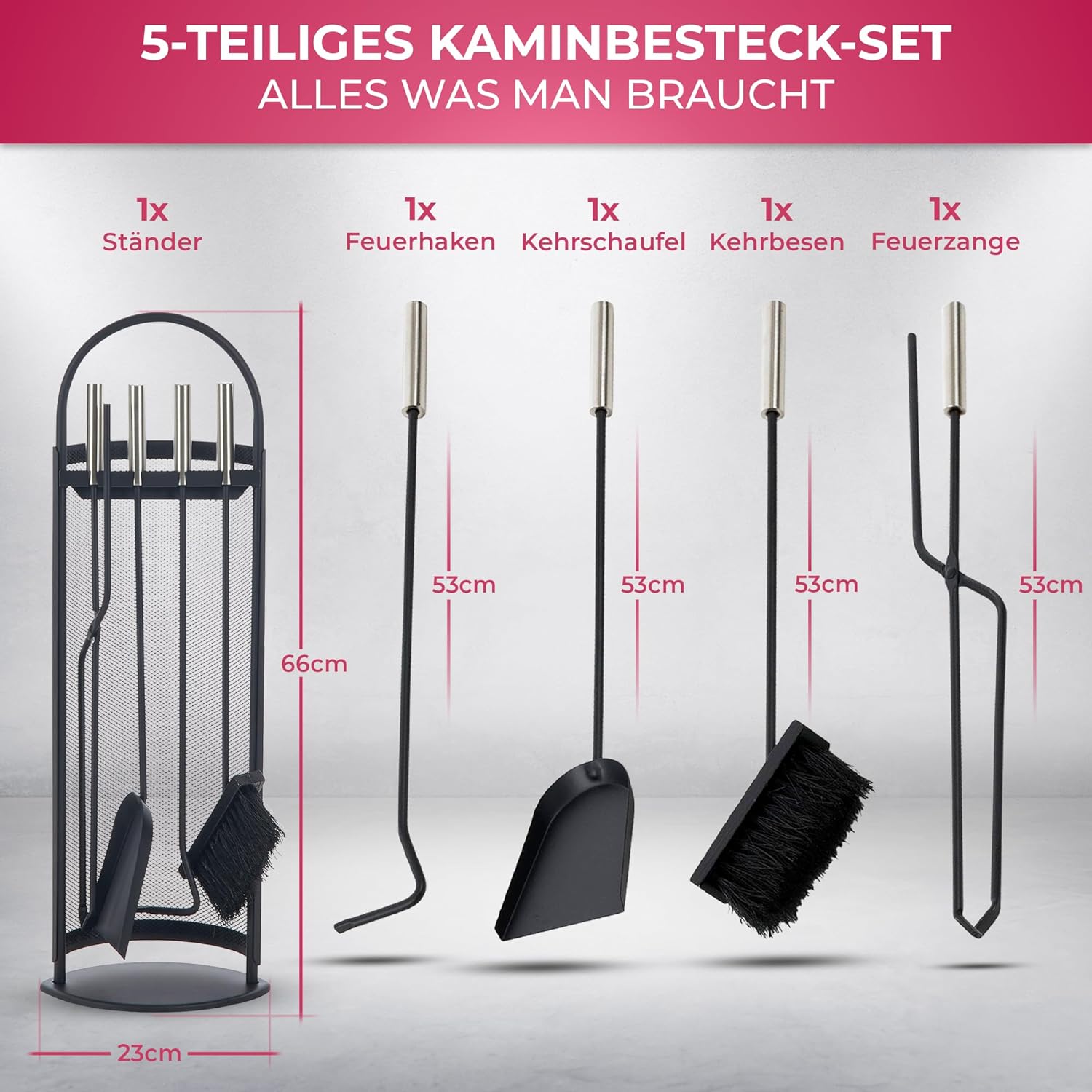 - 🔥DETAILS: 5-teilig Kaminschaufel, Kaminbürste, Kaminzange, Schürhaken, Ständer | Material: Stahl | Grösse Ständer: (H x B x T): 66 x 23 x 15 cm | Länge Ascheschaufel, Besen, Schürhaken und Zange: ca. 53 cm