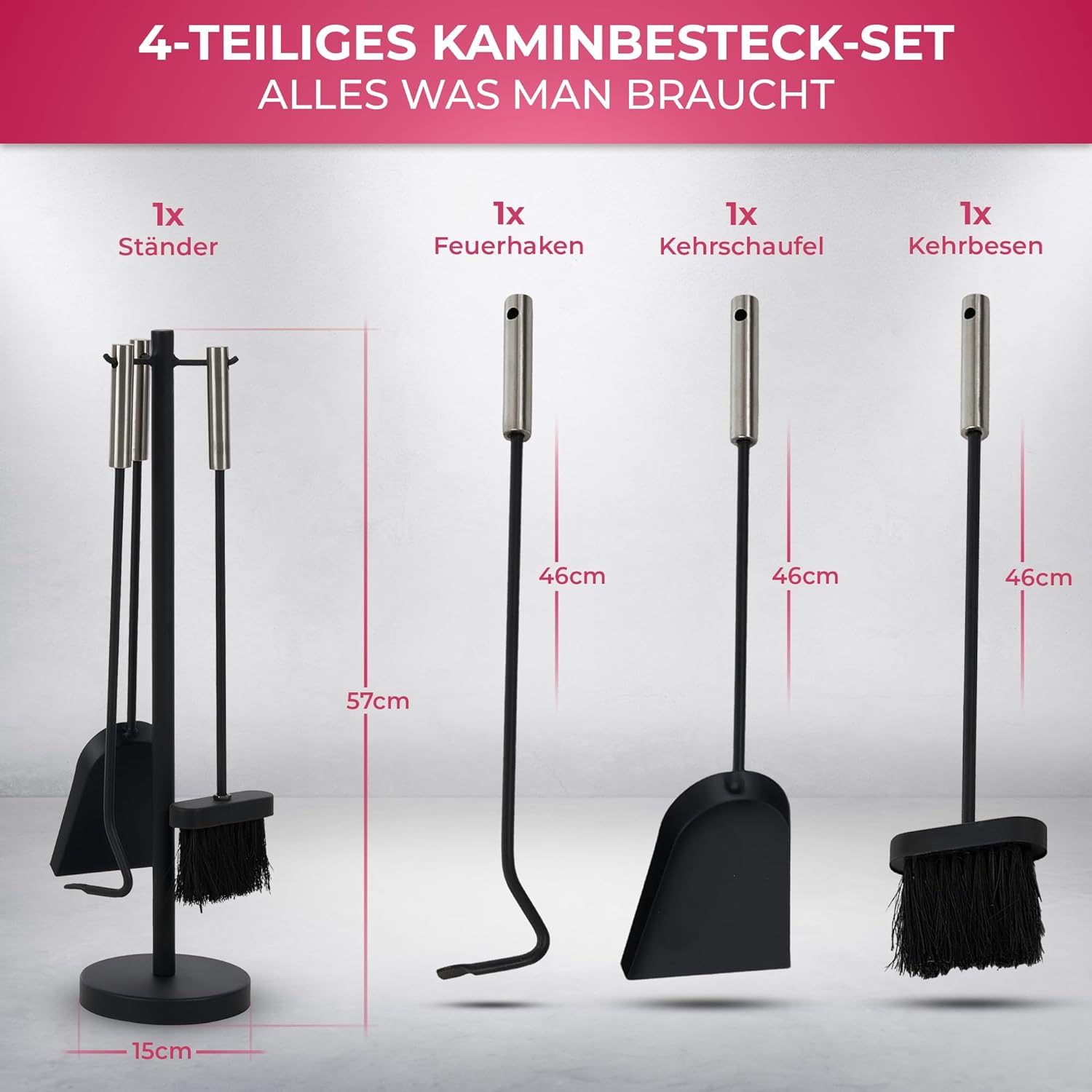 - 🔥DETAILS: 4-teilig Kaminschaufel, Kaminbürste, Schürhaken, Ständer | Material: Stahl schwarz | Grösse Ständer: (H x B x T): 57 x 15 x 15 cm | Länge Ascheschaufel, Besen und Schürhaken: ca. 46 cm