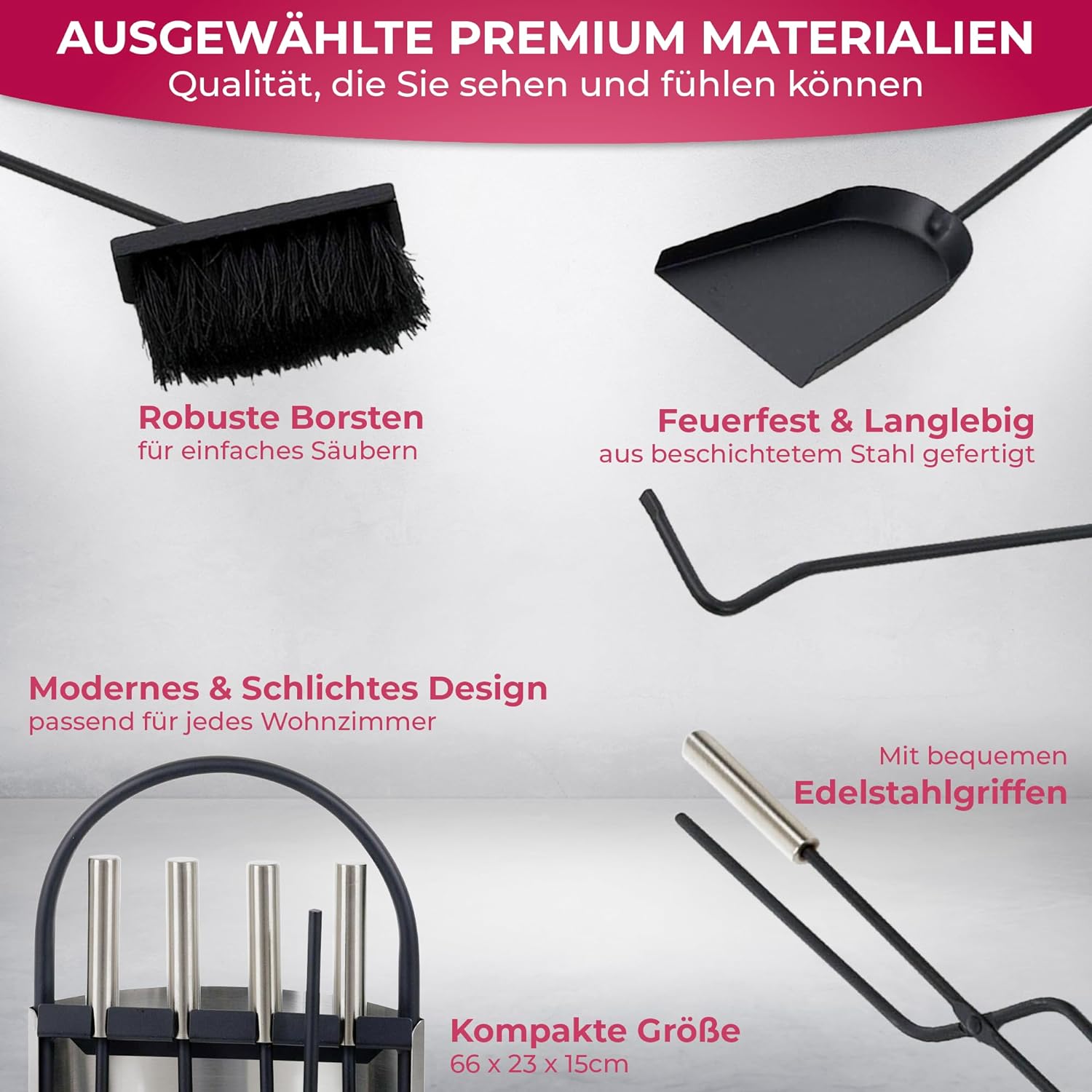 - 🔥DETAILS: 5-teilig: Kaminschaufel, Kaminbürste, Kaminzange, Schürhaken, Ständer | Material: Edelstahl, Stahl | Grösse Ständer: (H x B x T): 66 x 23 x 15 cm | Länge Ascheschaufel, Besen, Schürhaken und Zange: ca. 53 cm