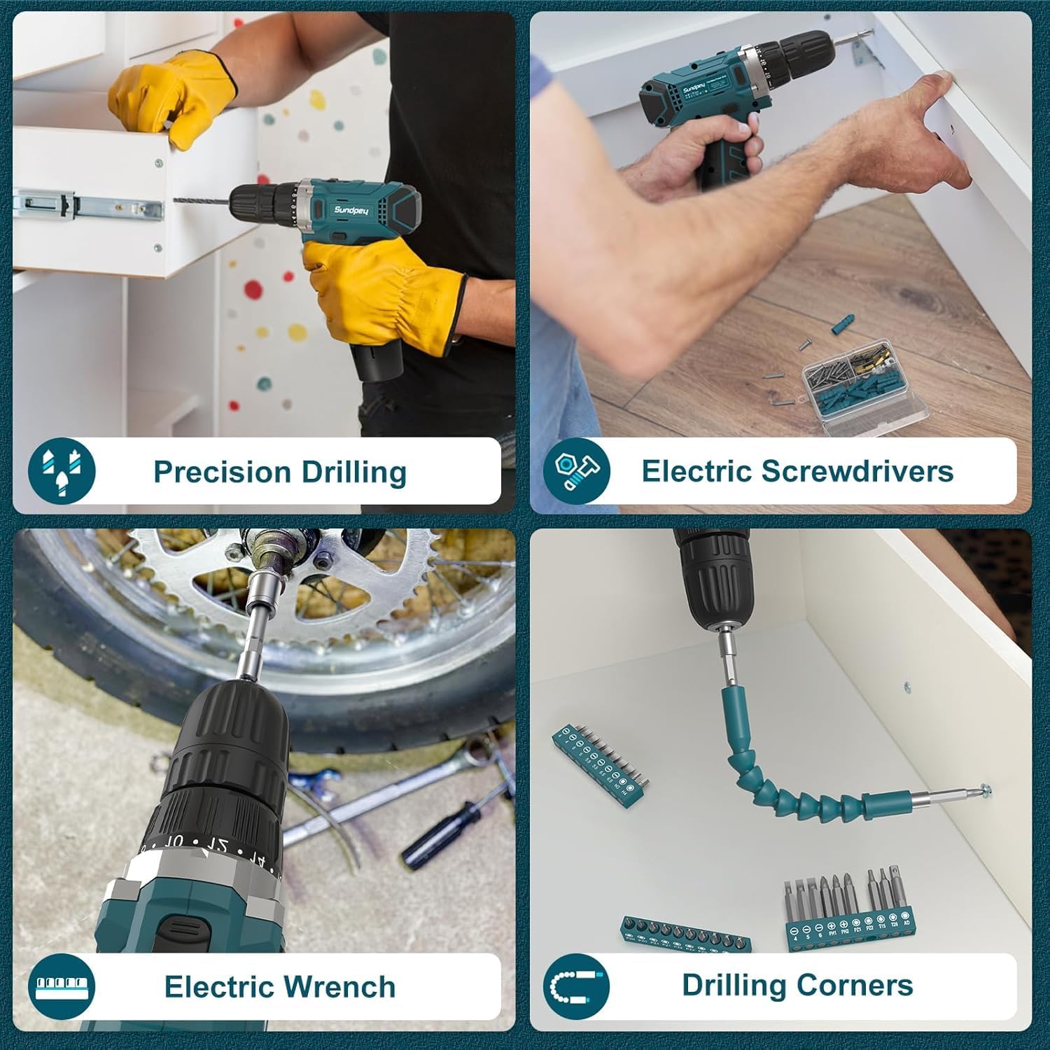 - Anwendungsszenarien des Werkzeugset mit Akkuschrauber: Unser Bohrer eignet sich für leichte Arbeiten, wie das Anbringen und Lösen von Schrauben an Tischen, Bilderrahmen, Türrahmen, Stühlen und vielem mehr. In Situationen mit begrenztem Platzangebot