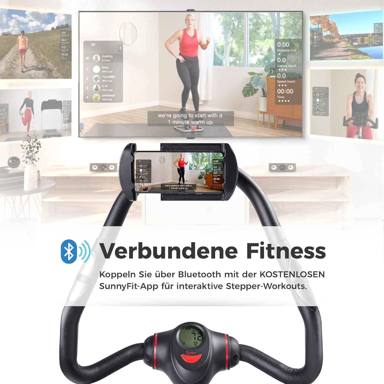 - 【VERBUNDENE FITNESS】 Koppeln Sie über Bluetooth mit der SunnyFit-App, um Fortschritte zu verfolgen, Ziele zu setzen und in über 1000 virtuelle Trainingseinheiten und über 10.000 globale Routen einzutauchen.