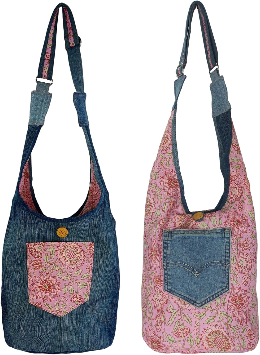 Sunsa Damen nachhaltige Hobo Tasche. Umhängetasche aus recycelte Jeans & Baumwolle. Boho Blumig Cros