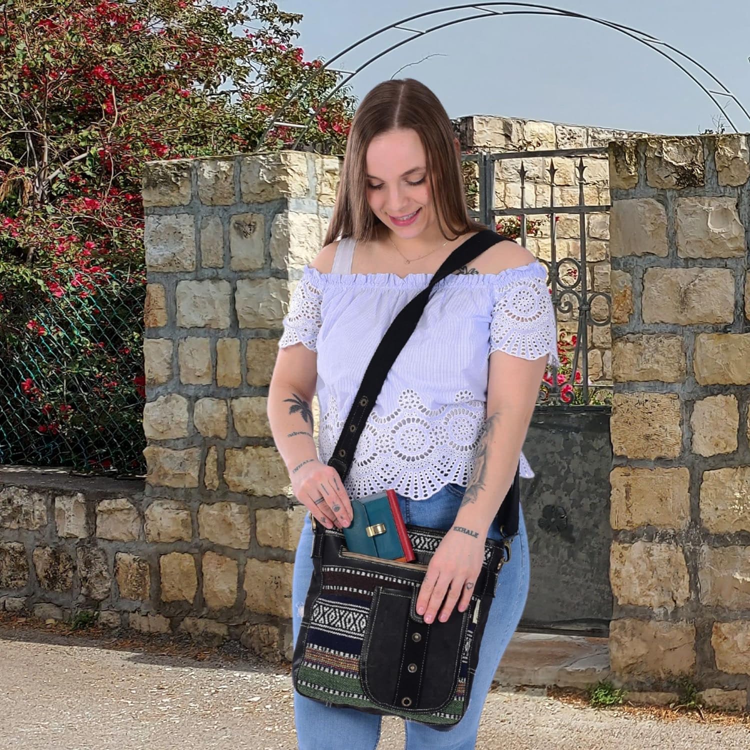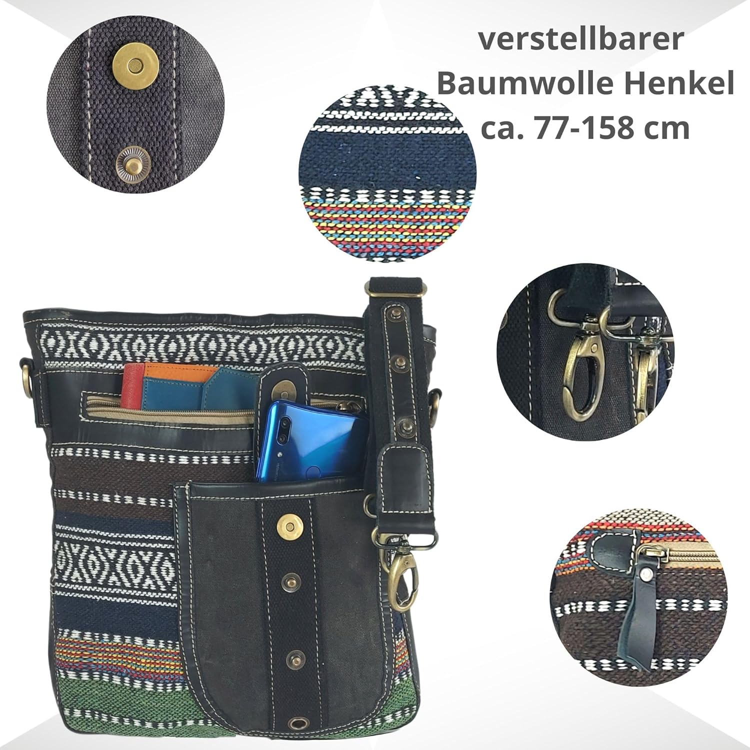 Sunsa Damen Umhängetasche. Crossbody Bag mit Streifen Design. Schultertasche aus Baumwolle & Leder.