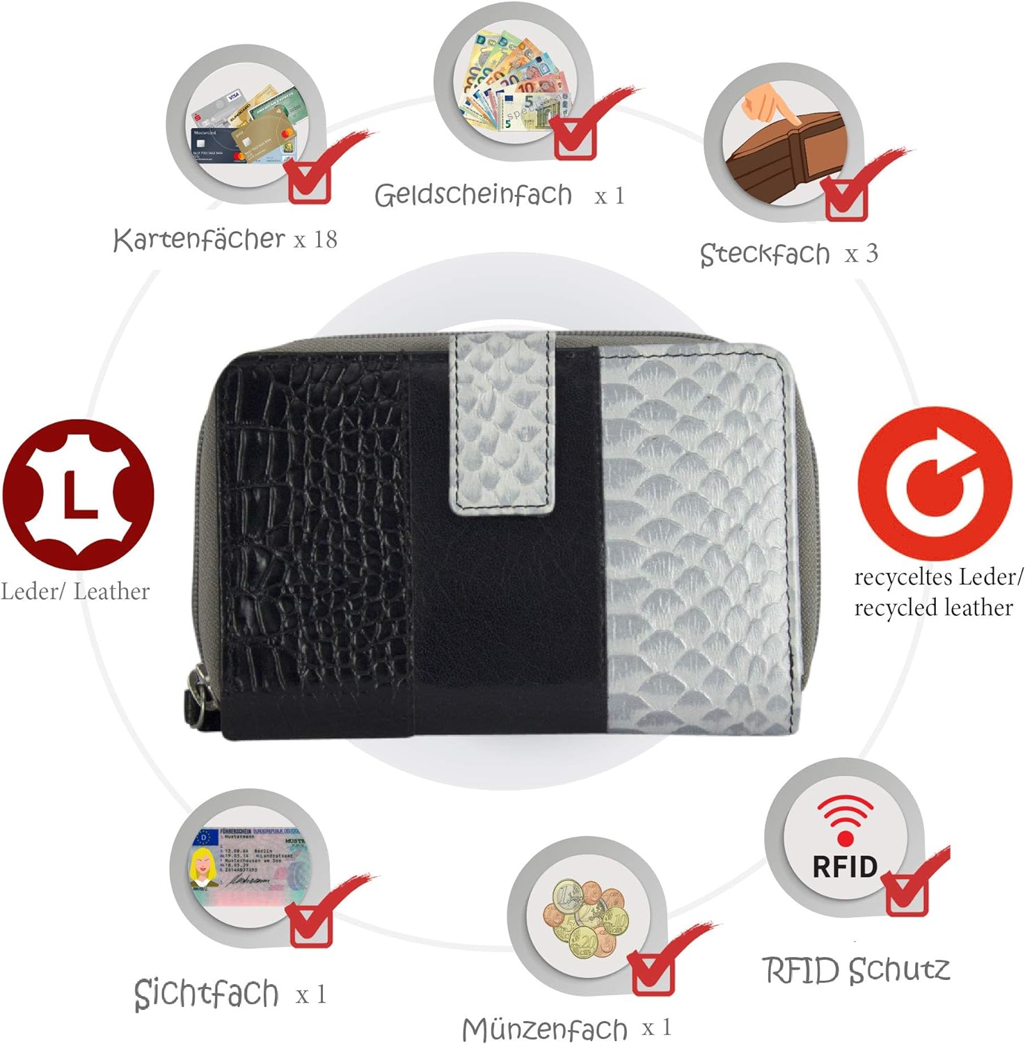 - Ideale grösse: Ca. 15x10x3 cm. INNENAUFTEILUNG: 18 Kartenfächer, 1Geldscheinfach, 1 Münzenfach, 3 Steckfächer, 1 Sichtfach. RFID Schutz Geldbörse