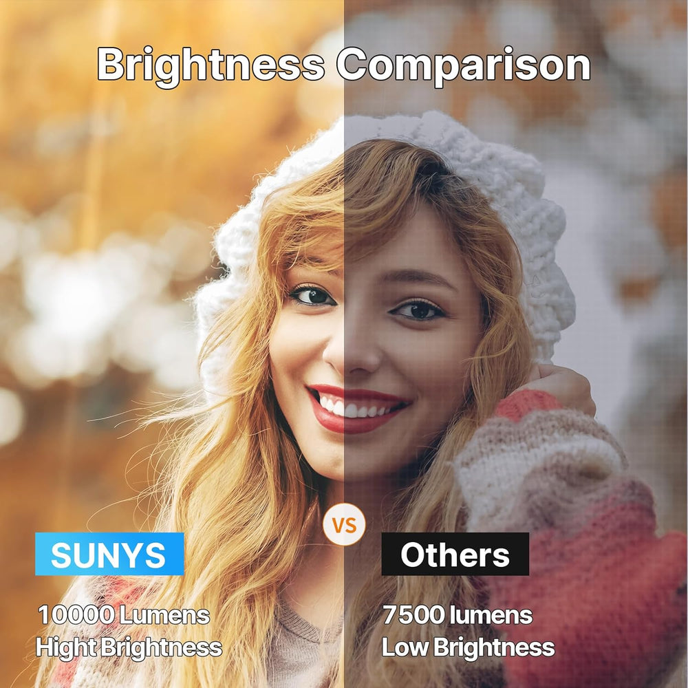 - 10000 Lumen High-Definition & 2024 Upgraded 1080P Beamer: Sunys Beamer hat eine Farblichtleistung von 10000 Lumen, 1920x1080P Auflösung, Mit einem Kontrastverhältnis von bis zu 10.000:1 und der LCD-Farbwiedergabetechnologie projizieren die. Dadurch
