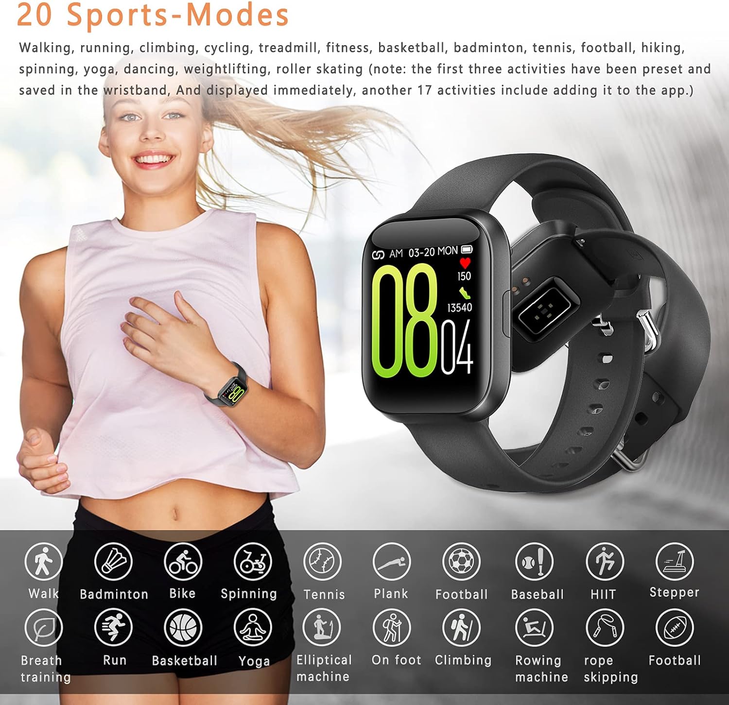• 1,54 Zoll Full Touch HD Bildschirm, Rasterliste zwei Stile zur Auswahl. Fitness Tracker mit 20 Trainingsmodi: Laufen, Joggen, Radfahren, Wandern, Fitness, Laufband, Basketball, Tennis, Klettern, Badminton, Dynamik, Yoga, Fussball, Tanzen, Gewichtheben,