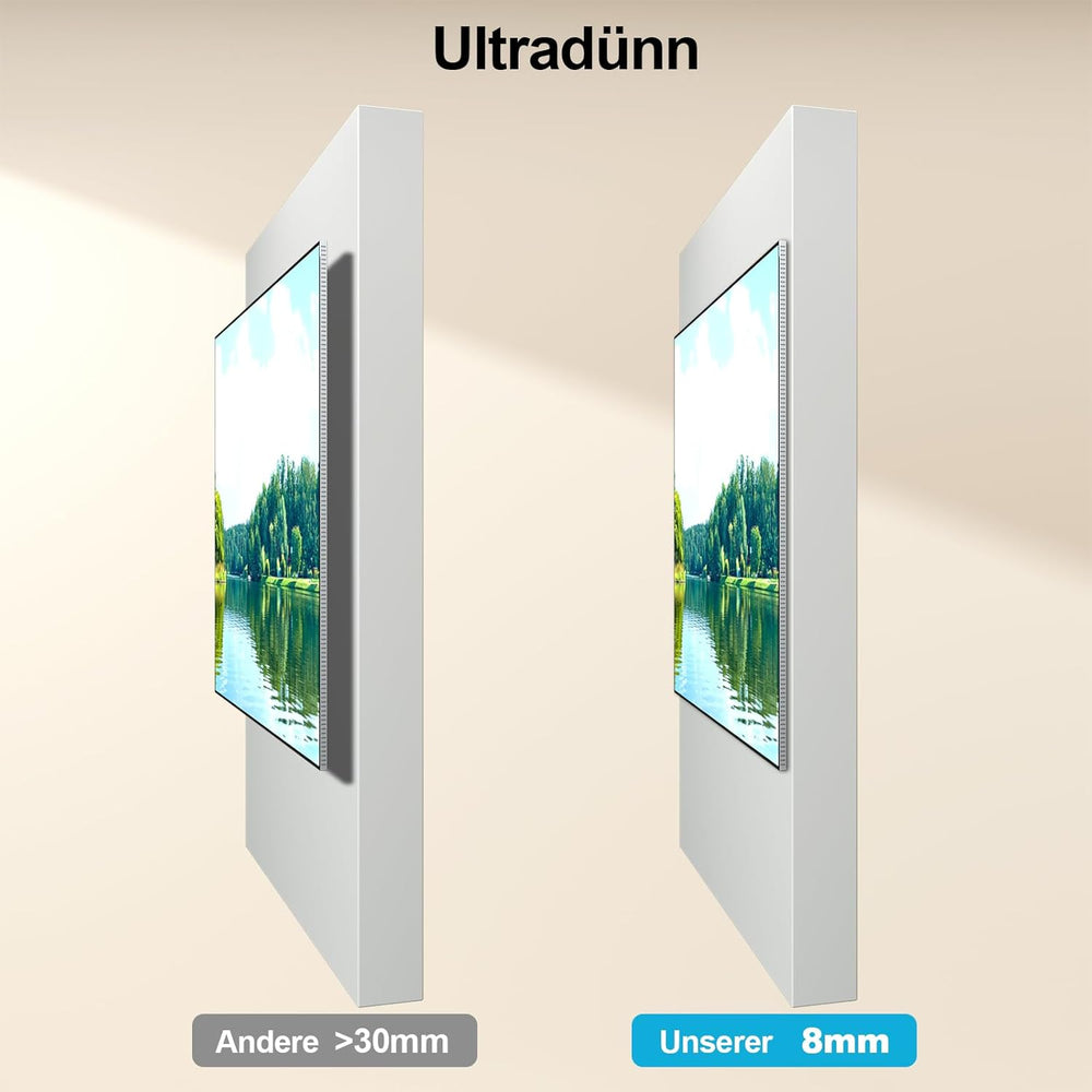 - Dünnste TV-Halterung: Unsere platzsparende Slim Fit TV-Wandhalterung verleiht Ihrem Zuhause einen modernen, minimalistischen Look. Ihr Fernseher sitzt besonders fest an der Wand und lässt nur einen Spalt von 0,8cm zwischen Fernseher und Wand. Sieht aus