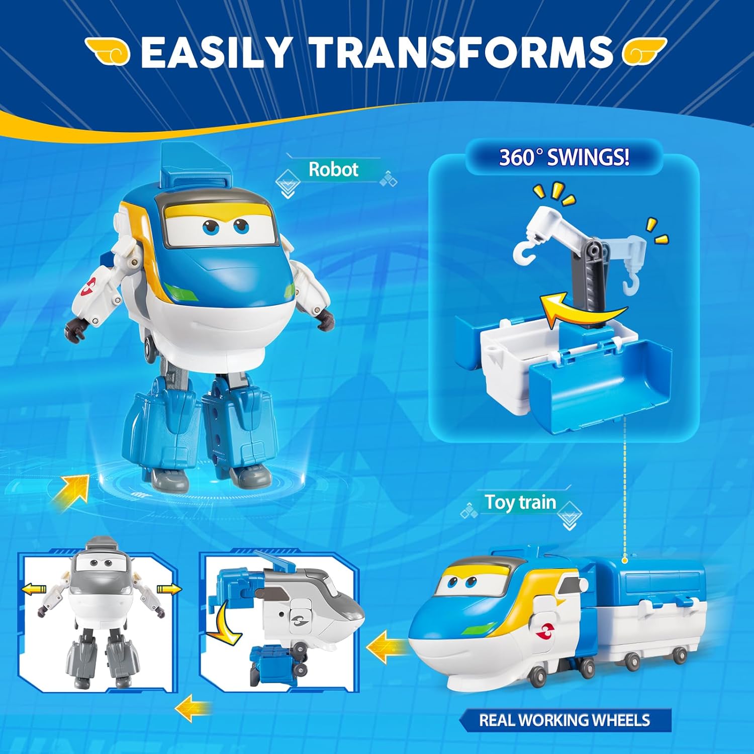 - Super Wings Tony – Im Zugmodus erzeugt Tony unter sich elektrische HoloLight-Schienen und saust so mit hoher Geschwindigkeit über die Gleise. Er kann ausserdem Waggons entfalten, die mit coolem Zubehör beladen sind und Sitzplätze für Fahrgäste