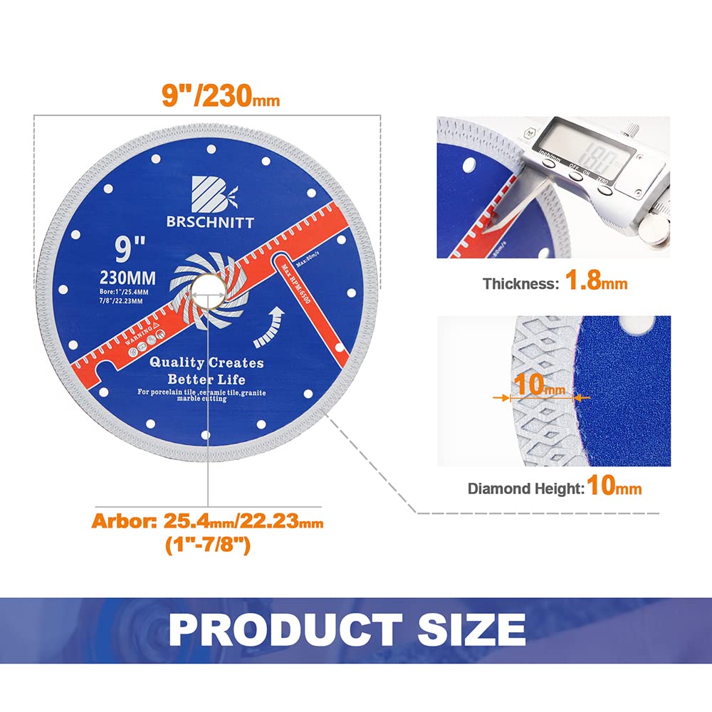 • ✔Grösse -1 Stück 230 mm, Diamanthöhe 10 mm, Segmentdicke 1,8 mm, Dorn 25,4 mm-22,23 mm, Nass- oder Trockenschneiden